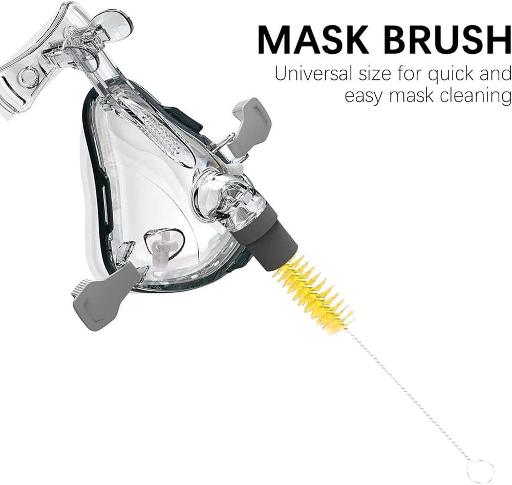 فرشاة القناع: بالإضافة إلى فرشاة خرطوم CPAP، نقدم أيضًا فرشاة قناع ذات شعيرات ناعمة لن تلحق الضرر بالقناع. يمكنه بسهولة تنظيف الشقوق الصغيرة ونقاط الاتصال، مما يضمن نظافة كل جزء من نظام CPAP.