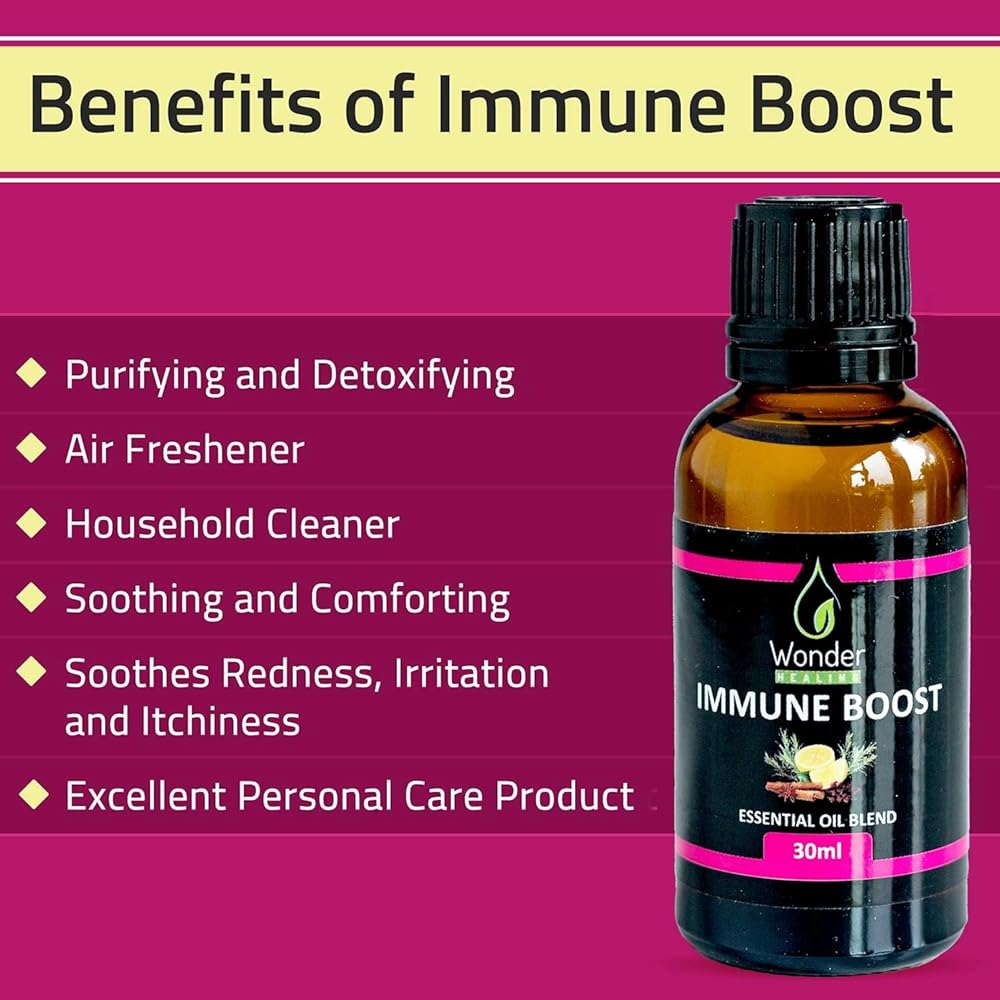 • 100% NATURAL ESSENTIAL OIL -Therapeutic Grade Immune Boost essential oil blend is a powerful combination of Clove, Cinnamon, Rosemary, Lemon and Eucalyptus effectively work together to boost the immune system via aromatic therapy it helps eliminate smells from environment An important addition to regular home cleaning regiment and an excellent personal care product.