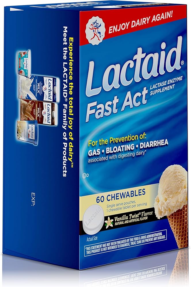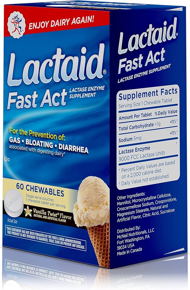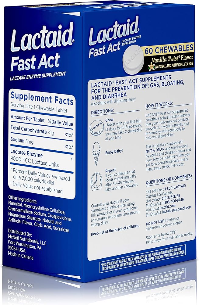تحتوي هذه الأقراص القابلة للمضغ على 9000 وحدة لاكتاز من إنزيمات اللاكتاز FCC، وتقوم بتكسير سكر الحليب للمساعدة في تقليل الانزعاج الناتج عن حساسية الألبان بسبب اللاكتوز.