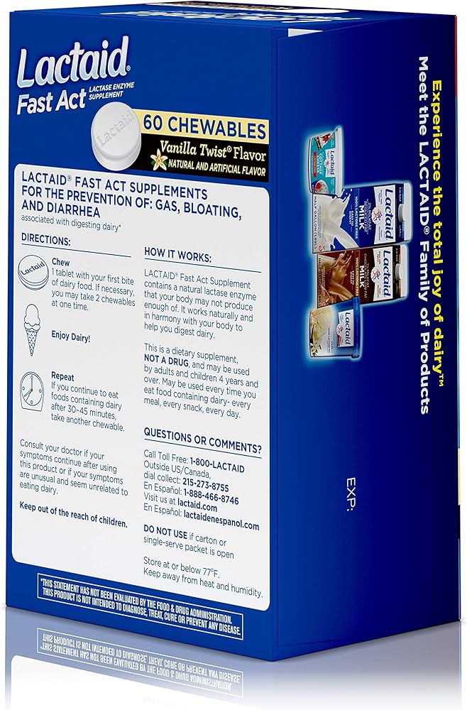 تعمل أقراص Lactaid Fast Act القابلة للمضغ مع نكهة الفانيليا تويست بسرعة لجعل منتجات الألبان سهلة الهضم لأولئك الذين يعانون من عدم تحمل اللاكتوز أو حساسية الألبان، حتى تتمكن من الاستمتاع بكل شيء على طبقك. يساعد هذا المكمل الهضمي على منع الغازات والانتفاخ والإسهال الذي يعاني منه الكثير من الأشخاص بعد تناول الأطعمة التي تحتوي على منتجات الألبان. تحتوي إنزيمات اللاكتيز الموجودة في هذا المكمل الغذائي على 9000 وحدة لاكتاز FCC للمساعدة في منع الأعراض المرتبطة بعدم تحمل اللاكتوز عن طريق تكسير سكر الحليب (اللاكتوز)، لذلك تكون منتجات الألبان أسهل في الهضم. تتميز هذه المضغات اللذيذة بنكهة فانيليا تويست الناعمة وتبدأ في العمل مع أول قضمة أو رشفة من منتجات الألبان. كوشير معتمد ومناسب للأعمار من 4 سنوات فما فوق، تتوفر كبسولات Lactaid Fast Act القابلة للمضغ في عبوات سفر مريحة مما يجعلها مثالية لتخفيف منتجات الألبان أثناء التنقل.