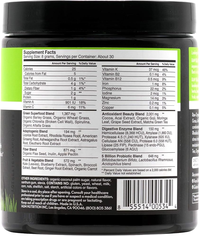 مسحوق سوبر جرينز مع إنزيمات هضمية - يحتوي مسحوق جرين سوبر فود هذا على مزيج من أكثر من 30 نوعًا من الأطعمة الفائقة بما في ذلك مضادات الأكسدة والمكيفات والبروبيوتيك في مسحوق متعدد الاستخدامات لدعم البشرة الصحية التي تتوهج وتوفر دعم الطاقة الطبيعية من النباتات. قد توفر هذه التركيبة أيضًا دعمًا لعملية التمثيل الغذائي. *