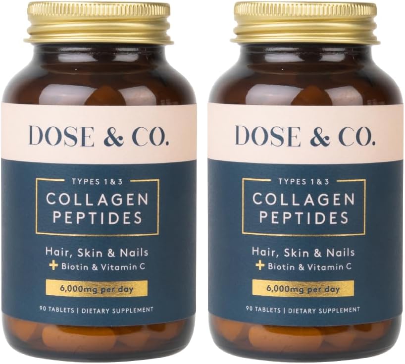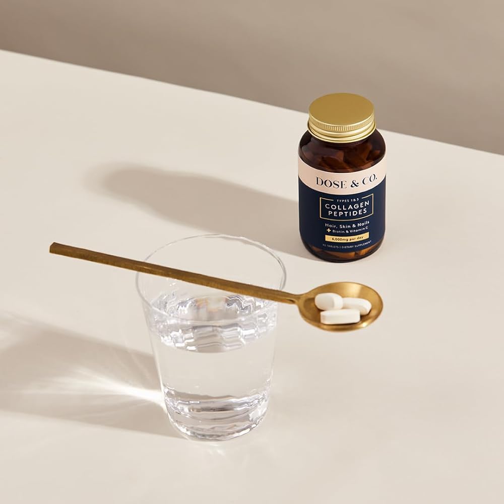 • THE POWER OF COLLAGEN: Dose & Co's beauty-boosting blends are a science-backed way to support the health of hair, skin and nails from the inside out. These Collagen Tablets target wrinkles, skin hydration, texture and firmness, along with nail strength and the health of hair. They also support energy levels, metabolism function, antioxidant defenses, iron formation and the health of bone and connective tissue.