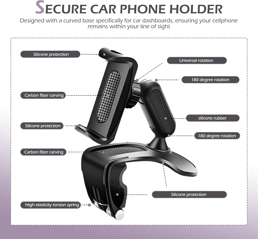 Firm Fixing: The clip of the holder can be firmly fixed on the dashboard, rearview mirror, sun visor of the car to ensure that the cell phone or other devices are not easy to slide or fall off during use.