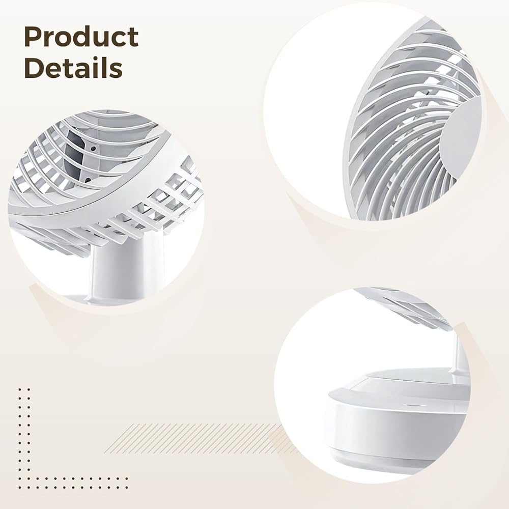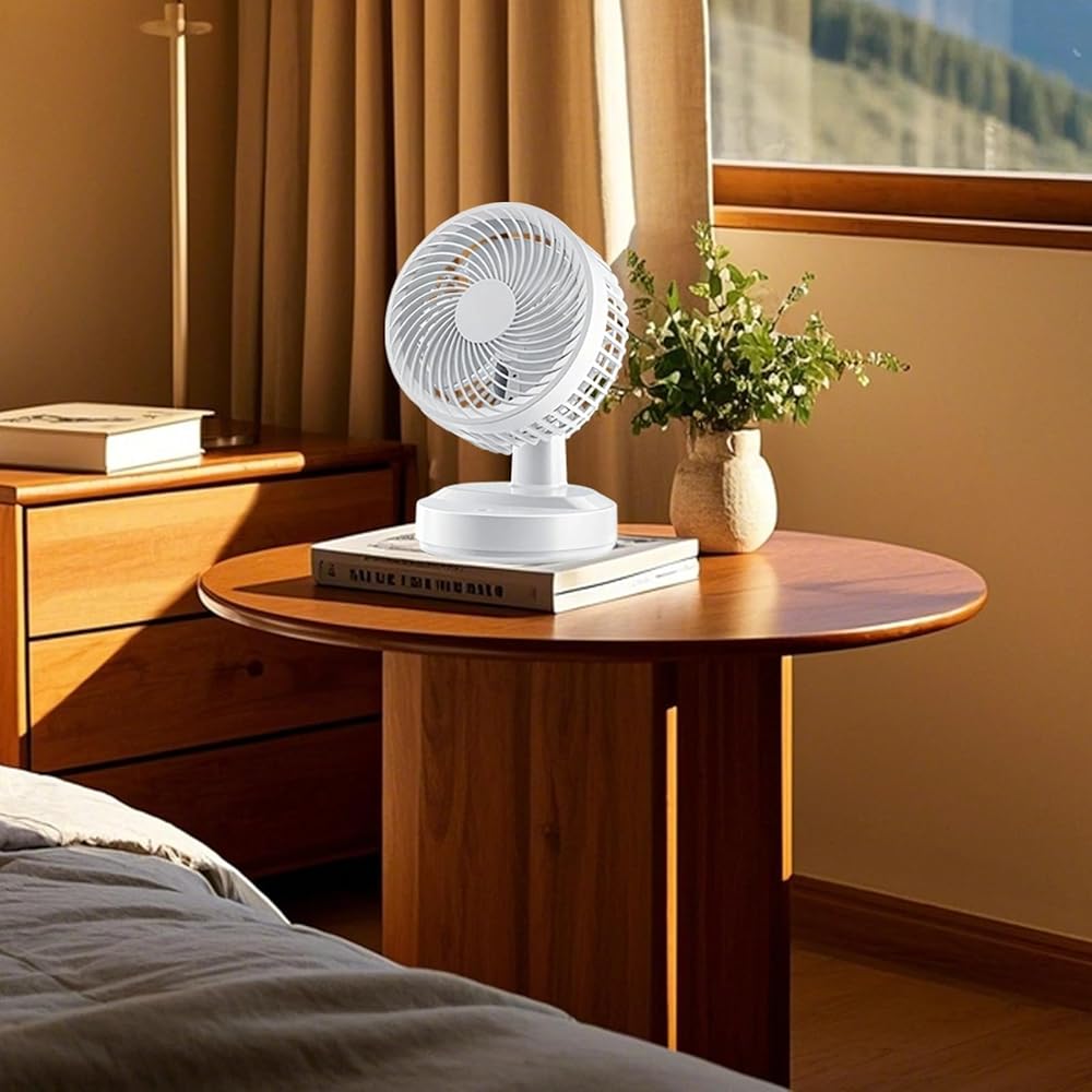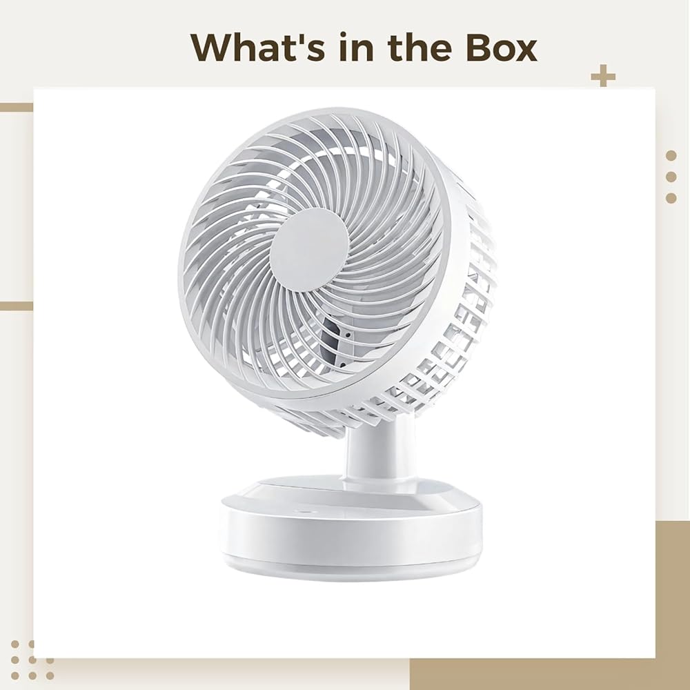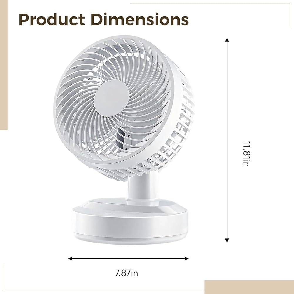 Color:white Material:plastic Product Size: 9.84 in x 7.87 in x 6.69 in Package Includes:small oscillating fan x 1 Note: - Please refer to the measurement. Tiny measuring error is allowable in normal range. - There might be a little color difference due to the monitor, camera or other factors, please refer to the physical item.