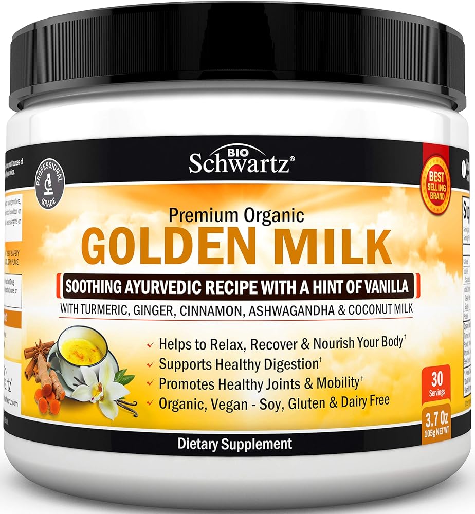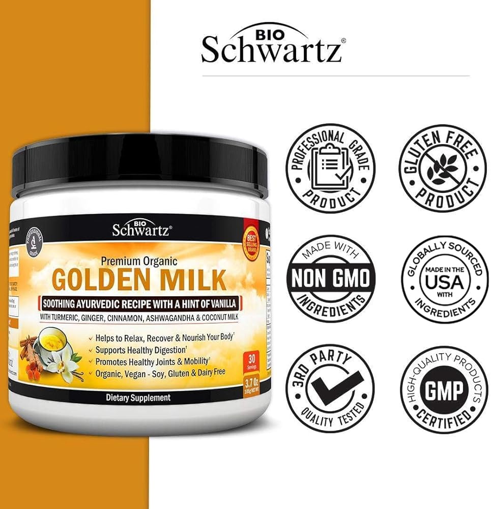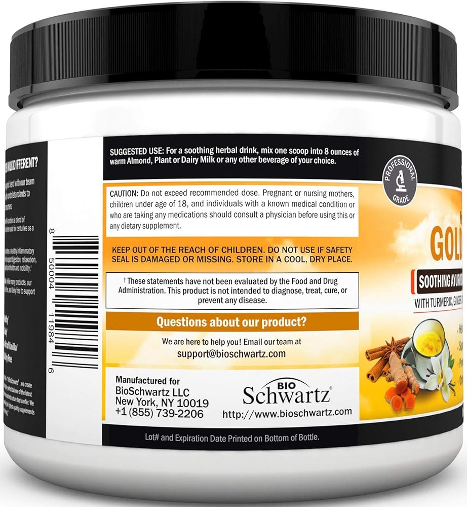 يدعم الاسترخاء: يحتوي الحليب الذهبي الخاص من BioSchwartz على مزيج فريد من الكركم والزنجبيل والأشواغاندا للمساعدة في تعزيز الاسترخاء.