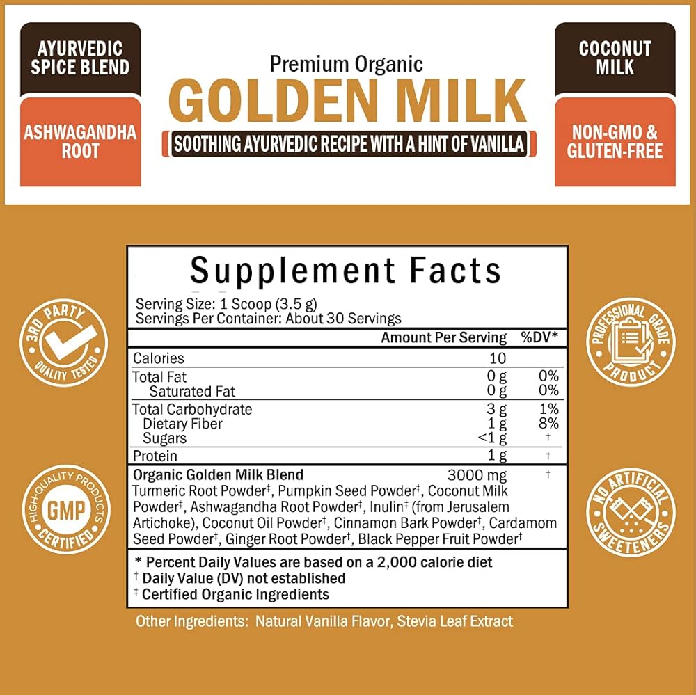 تم اختبار نقائه وخالي من مسببات الحساسية: تم اختبار كل دفعة من هذا الحليب الذهبي العضوي بواسطة طرف ثالث لضمان النقاء والفعالية والجودة. تم تصنيع هذه التركيبة بدون العناصر المعدلة وراثيًا أو الصويا أو الغلوتين أو القمح أو البيض أو الحليب أو الفول السوداني أو المحار أو المحليات أو السكر المضاف. كما أنه لا يشمل المواد الكيميائية أو إضافات الألوان أو الفول السوداني أو المواد الحافظة