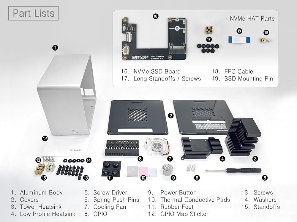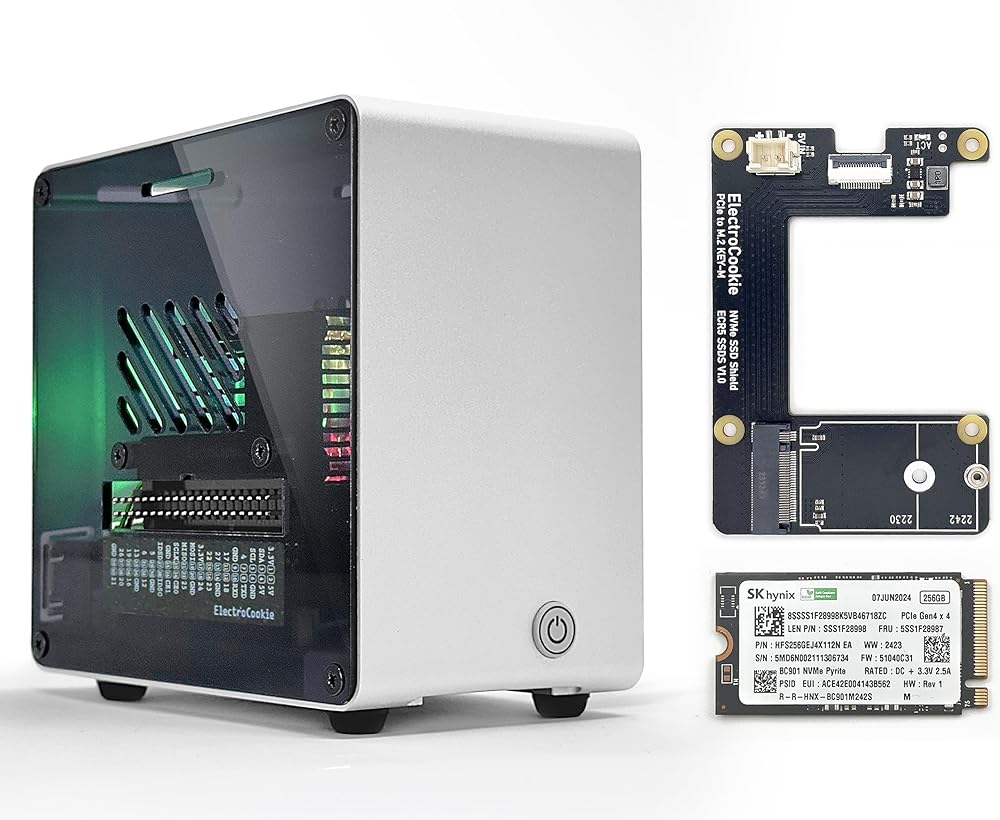 electrocookie mini tower case for Raspberry Pi 5 with PCIe M.2 NVME HAT & 256GB SSD (Silver)