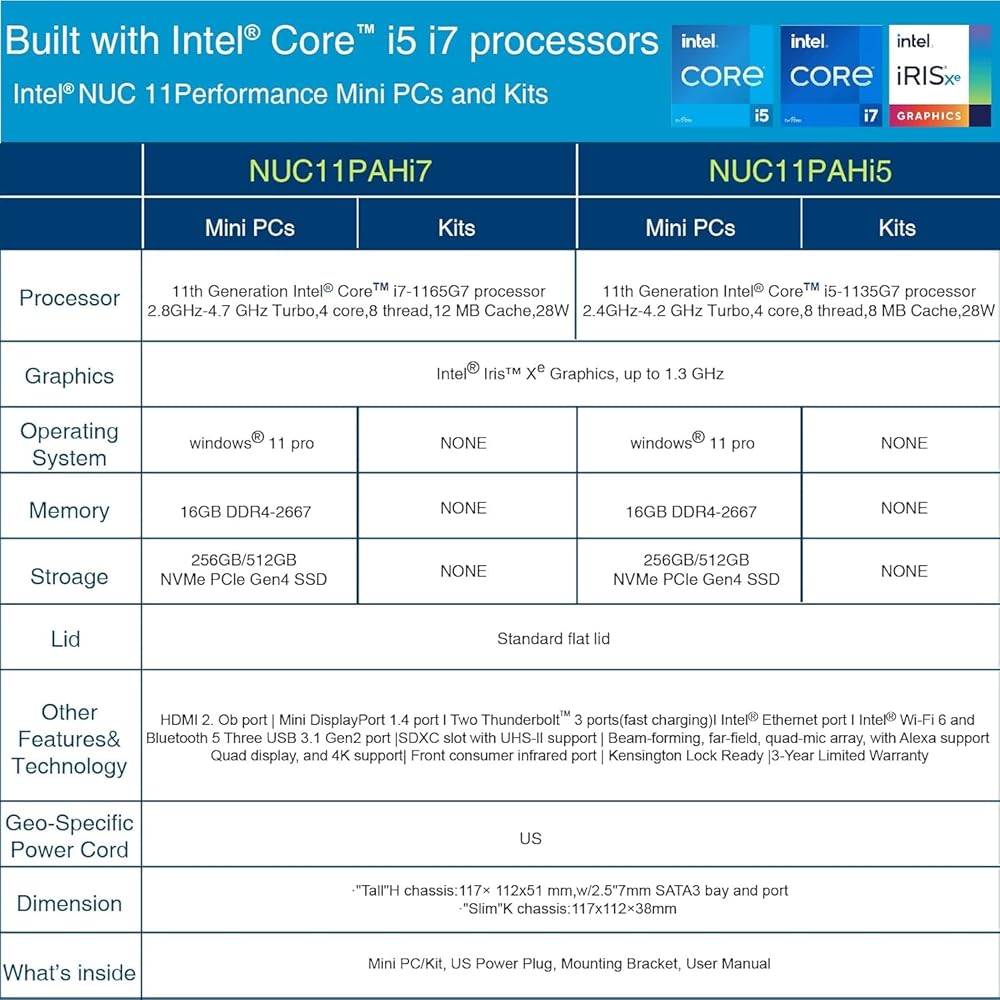 【Upgraded Processor】This Intel NUC NUC11PAHi7 configuration is our STANDARD Mini PC Barebone version, which not includes RAM+SSD. Featuring a Intel NUC Core i7-1165G7 Processor.