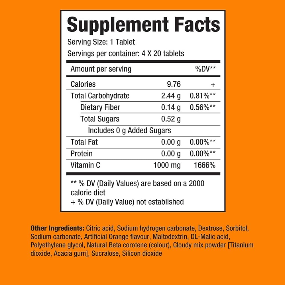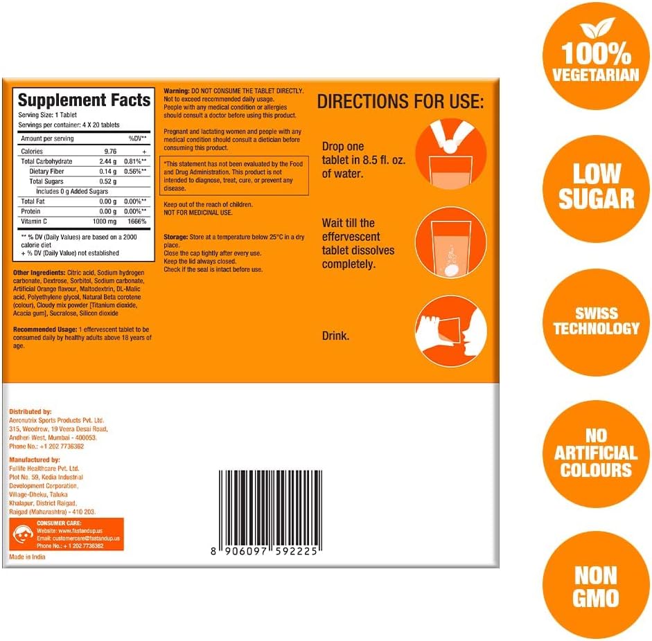 قم ببناء مناعتك: Fast&Up Vitamin C 1000mg هو مكمل غذائي يومي فوار من فيتامين C. يتضمن 20 قرصًا فوارًا ذو جرعة واحدة بنكهة البرتقال اللذيذة. توفر كل حصة دعمًا مناعيًا يوميًا يحتوي على فيتامين C أكثر من 10 برتقال