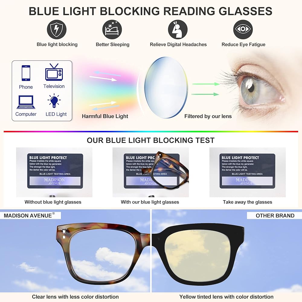 【عدسة مضادة للخدش مع تأثير حجب الضوء الأزرق】تم اختبار نظارات القراءة ماديسون أفينيو المضادة للضوء الأزرق واعتمادها من قبل آلة بصرية احترافية قطعة قطعة، للحصول على قوة دقيقة وتأثير أفضل ضد الضوء الأزرق. يمكن أن يساعدك على تحسين الرؤية وتخفيف إجهاد العين أثناء القراءة أو تصفح الكمبيوتر والهاتف والتلفزيون.