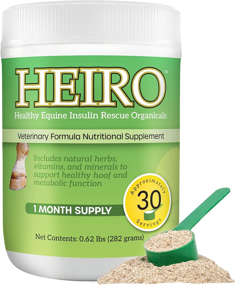 HEIRO provides natural nutritional support for horses suffering from chronic sore feet, laminitis, a history of founder, and other metabolic conditions. HEIRO is designed for horses with the cresty necks and fat pockets that develop as a result of elevated insulin levels. Helps fight laminar injury and foot pain. Developed by Dr. Frank Reilly after two years and hundreds of equine insulin tests led him to the right combination and concentrations of organicals to make horses more comfortable and help get them back on grass pasture. HEIRO contains a blend of organic herbs, magnesium, and vitamin E. Directions: Regular Schedule: Mix one scoop (enclosed) once a day in morning feed. If Foot Sore: Mix one scoop in morning feed and one scoop in evening feed for 10 days in a row, then switch to regular schedule.