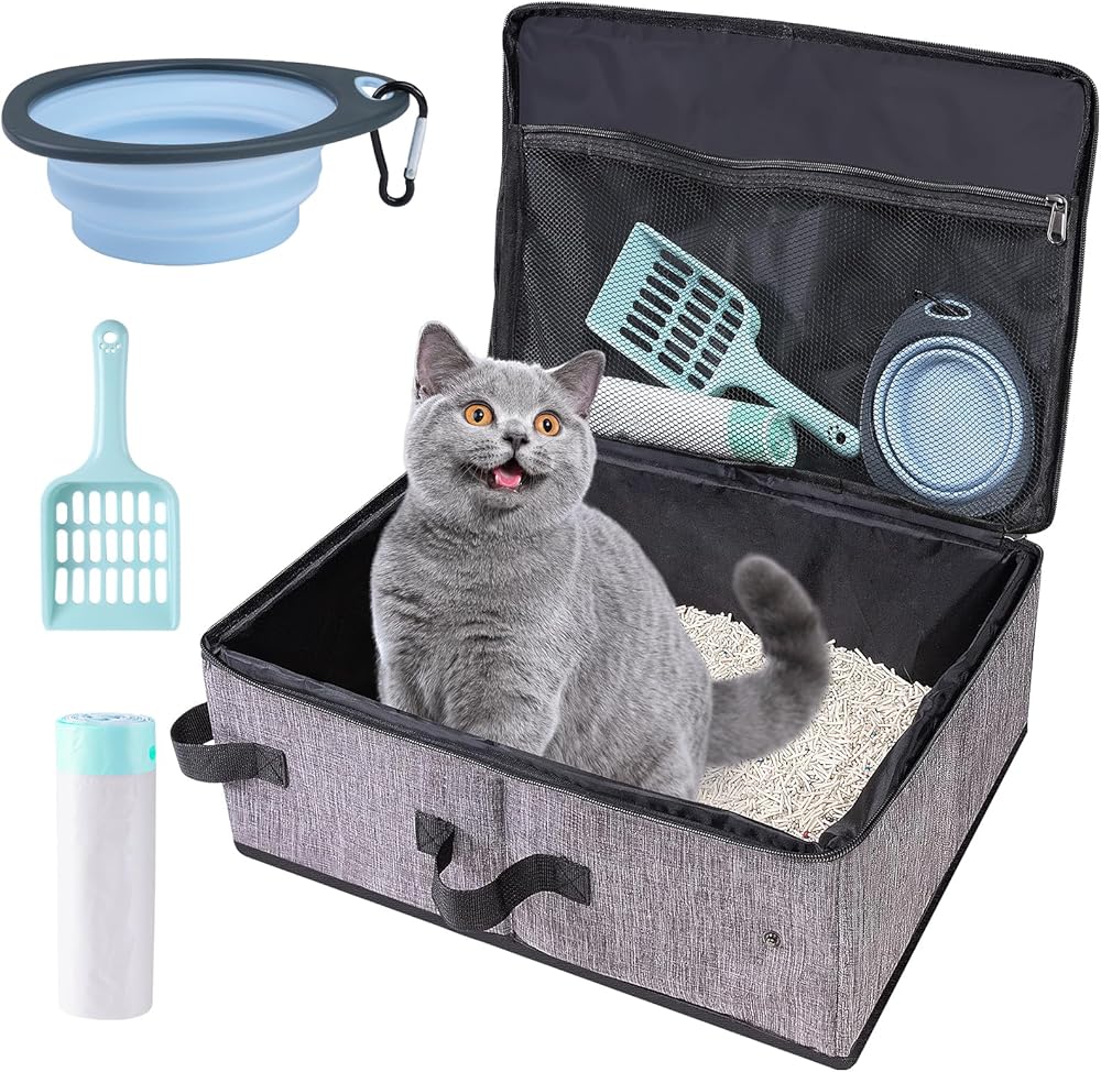 صندوق القمامة السفر للقطط في السيارة مع الغطاء والقطط القمامة مغرفة ، حافظة فضلات القط المحمولة مع وعاء و 10 أجزاء من أكياس بطانة قابلة للتصرف ، مقاومة للتسرب وقابلة للطي.