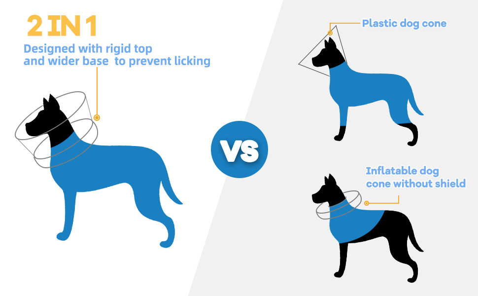مخروط الكلاب القابل للنفخ 2 في 1: بالمقارنة مع مخروط الكلاب التقليدية القابلة للنفخ ، تم تجهيز مخروط الكلب القابل للنفخ 2 في 1 بدرع قوي وقابل للفصل. إن الحرس القابل للفصل سهل الاستخدام ويمكن إرفاقه أو إزالته بسرعة حسب الحاجة. يمكنك إزالة الحيرة عندما يشرب كلبك أو تناول الطعام أو النوم. (إشعار: إذا انزلق ذوي الياقات البيضاء ، فإن الثابتة والمتنقلة تأكد من إدراج ذوي الياقات اليومية في الحلقة الداخلية ، فإنه يمكن أن يمنع الكلاب بشكل فعال من الهروب من ذوي الياقات البيضاء.)