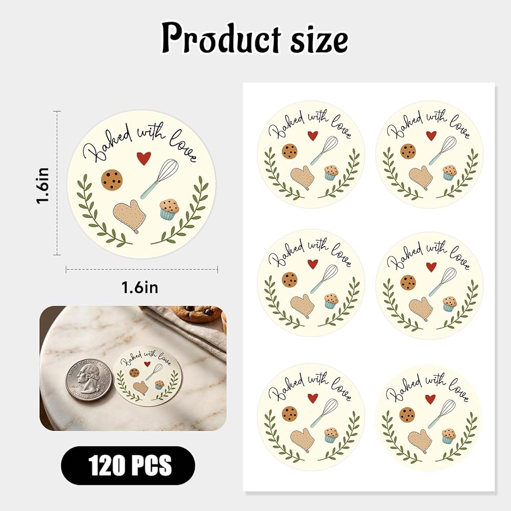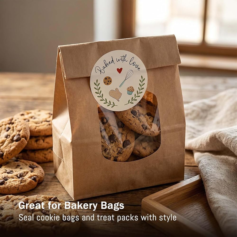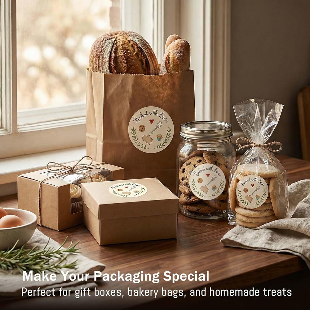Add a warm, handmade touch to your baked goods with our Baked with Love Stickers. These 1.6 inch round baking labels are printed with a charming “Baked with Love” message, perfect for sealing cookie bags, bread wraps, cupcake boxes, jars, and gift bags. Made from high-quality adhesive paper, they stick securely to most packaging surfaces and are easy to apply. Ideal for home bakers, small bakeries, and anyone who loves sharing homemade treats.