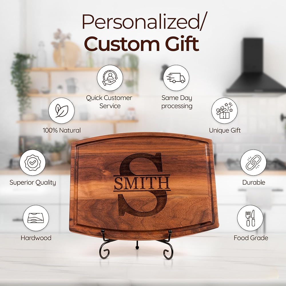 • High Quality Personalized Cutting Board made out of the best Quality Hardwood grown, harvested and handmade in the U.S, Permanently Laser Engraved Permanent to assure our product will last.