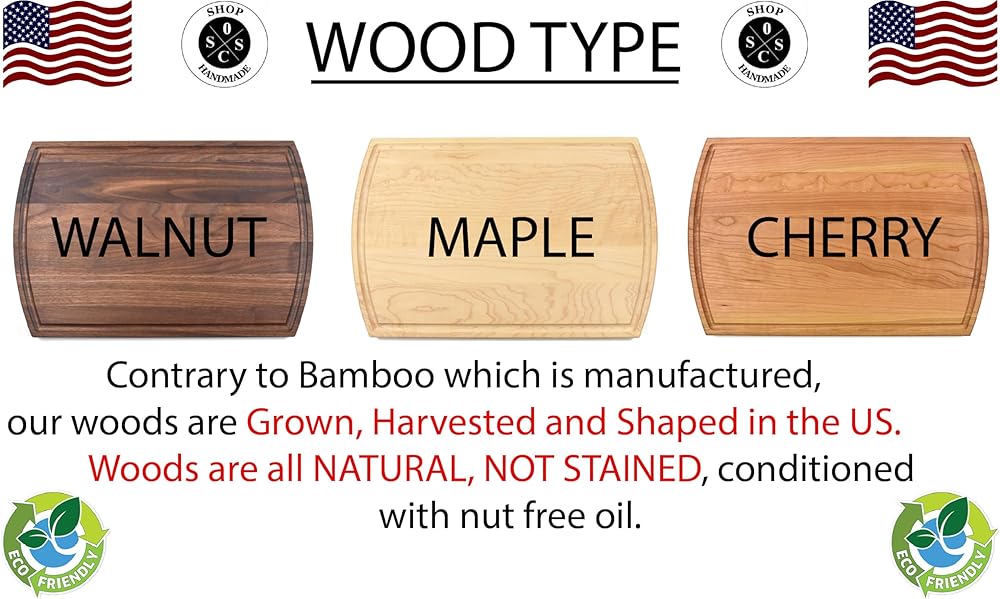 Made in USA. We use maple, Cherry and Walnut which are harwoods grown, harvested and shaped in the USA. They are in their natural color and ready to use when you receive it. Decor and Functional: You can display the board, use the design side as an accent for your charcuterie or cut on the side which has no design.