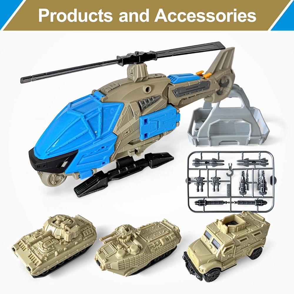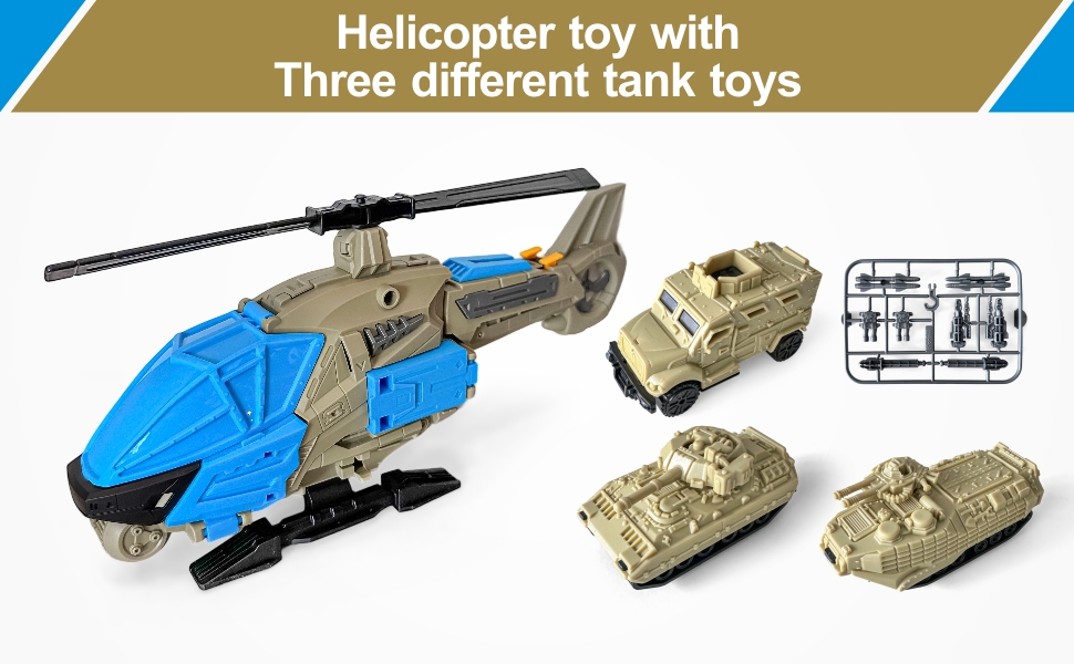 شملت لعبة الهليكوبتر لعبة PlaySet للأولاد ، وألعاب الهليكوبتر للأولاد الذين تتراوح أعمارهم بين 4 و 7 سنوات ، وتشمل طائرة واحدة و 3 دبابات ، وتصميم دائم ، وتفاصيل واقعية ، وهدية للأطفال
