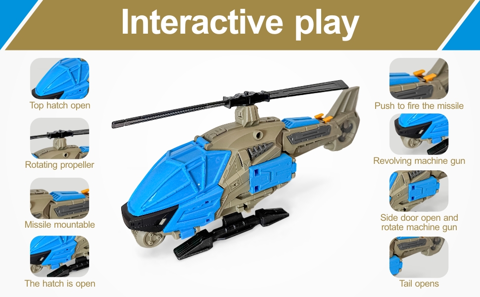 • التصميم التفاعلي والديناميكي: لعبة المروحية مروحة دوارة 360 درجة ، وأبواب قمرة القيادة/الشحن المفتوحة ، ومشرف الصواريخ (مع منفذ الإدراج لسهولة إطلاق النار). تتميز الطائرة بنسبة 90 درجة مدونة على كلا الجانبين ، في حين أن جميع المركبات خفيفة الوزن وسهلة على الأيدي الصغيرة للمناورة.