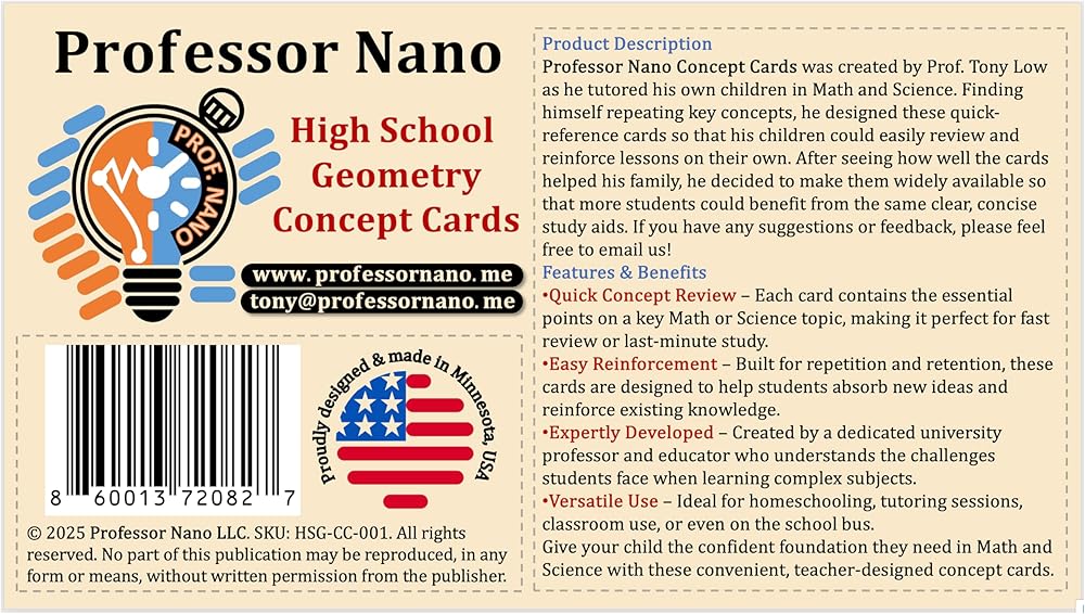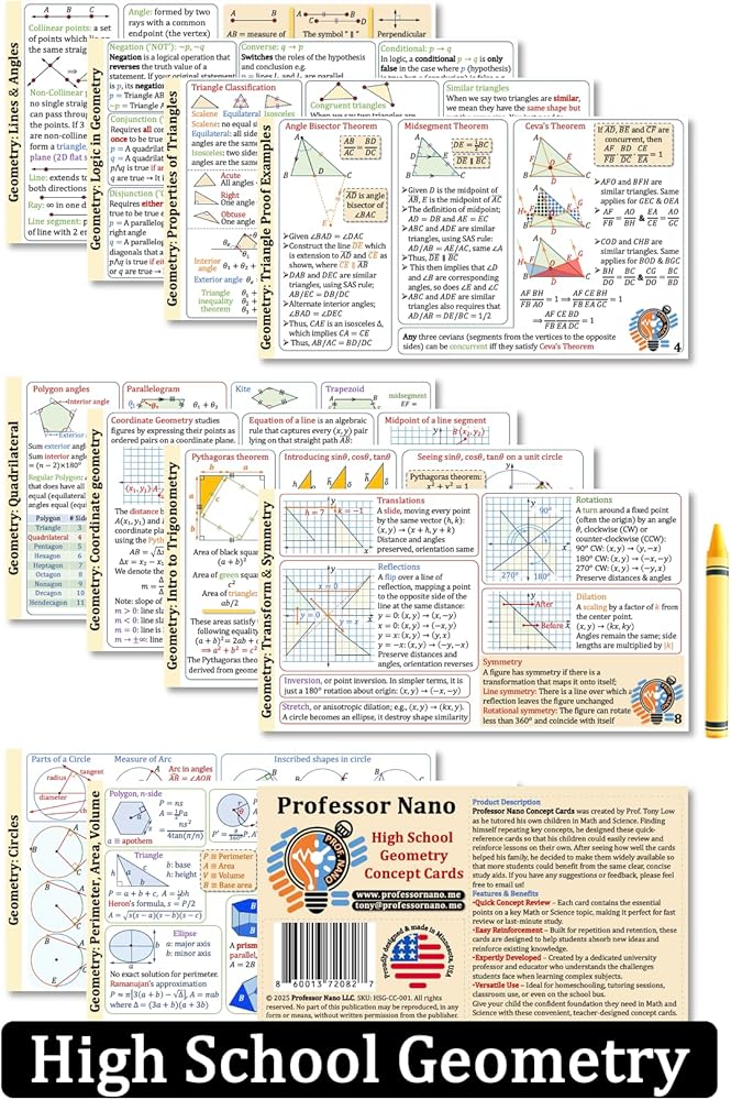 بطاقات مفهوم هندسة المدرسة الثانوية ، تشمل الموضوعات. ||| الخطوط والزوايا ||| منطق في الهندسة ||| خصائص المثلثات ||| أمثلة Triangle prof ||| الرباعي ||| تنسيق الهندسة ||| مقدمة في علم المثلثات ||| التحول والتماثل ||| دوائر ||| المحيط والمنطقة والحجم