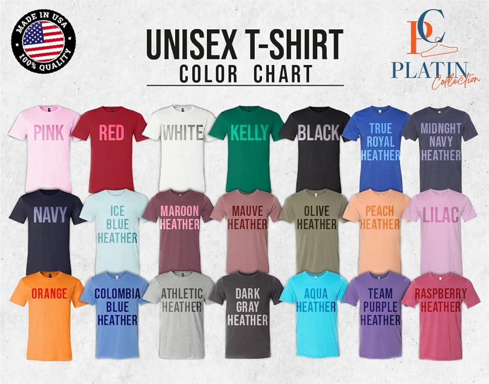 HOW TO ORDER? It's easy to place an order! Please check the theme, color, and size of all images in this listing. - From the drop-down menus, choose the shirt's size and color. - For personalization, fill in the blank box with your design color. Please look at the photos in this listing to see what colors are available. (Example: Design Color White) - Select the quantity - Add to cart - Proceed to checkout *Please ask for sizes and colors that are not available on our size charts. ABOUT Tees Our Tees are made in the USA. At Bella+Canvas our motto is to be Different. Fabrication: Solid Colors: 100% Airlume combed and ring-spun cotton. Heather Colors: 52% Airlume combed and ring-spun cotton. Athletic Heather: 90% Airlume combed and ring-spun cotton, 10% poly HOW TO WASH ? - Please turn the tee inside out before washing - Warm machine wash in gentle cycle - Do not bleach - Do not dry clean - Do not iron over the foil