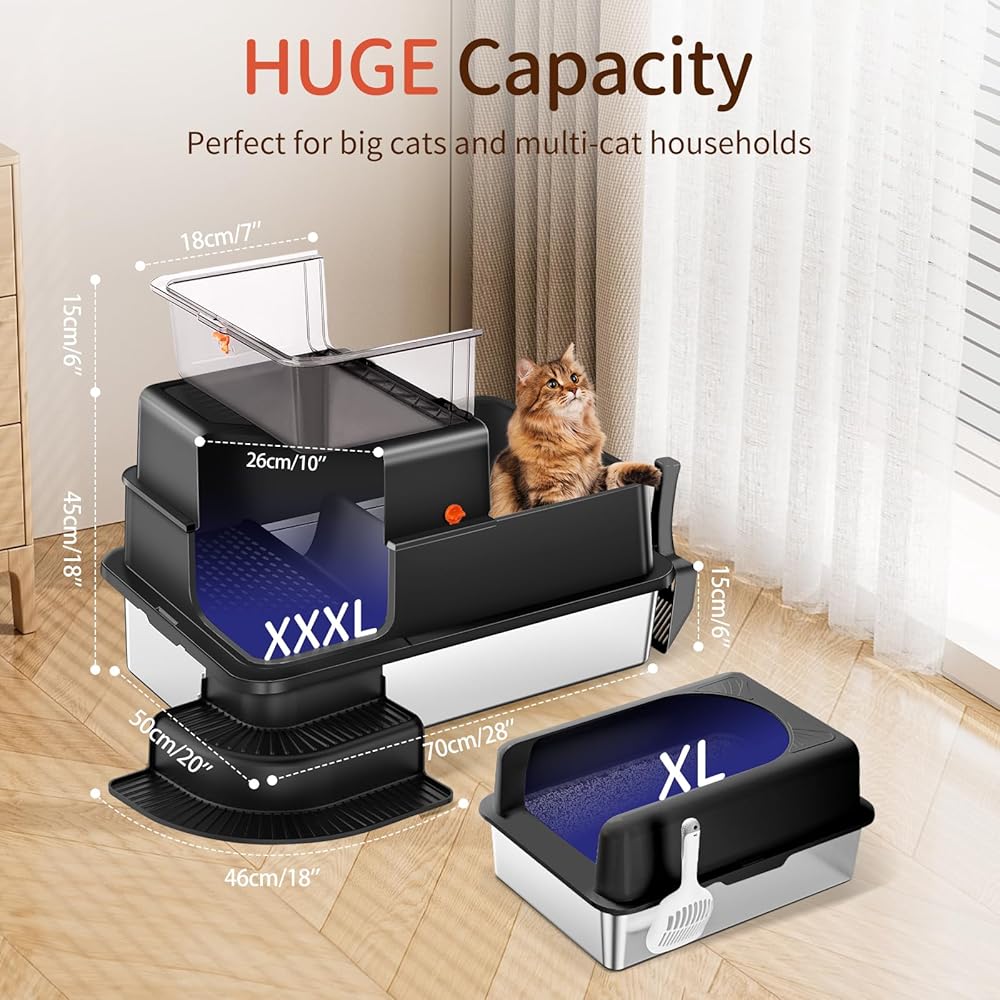 • XXXL Extra Large Litter Box: Our stainless steel litter box measures 28"x20"x12"/70 x 50 x 30cm. The raised and widened stainless steel cat litter box Provides them with plenty of room to deal with their poop comfortably, accommodating about 50L of cat litter, making it very suitable for medium to large cats or multiple cats