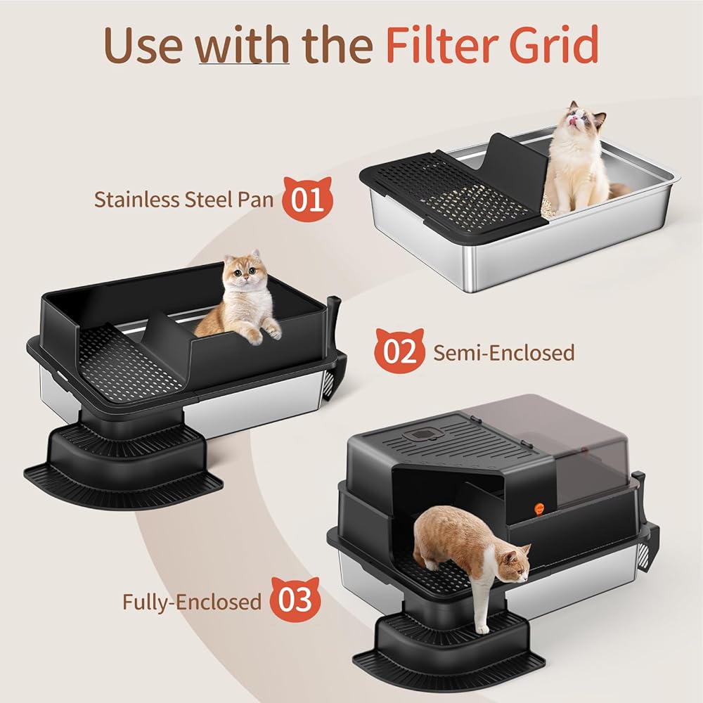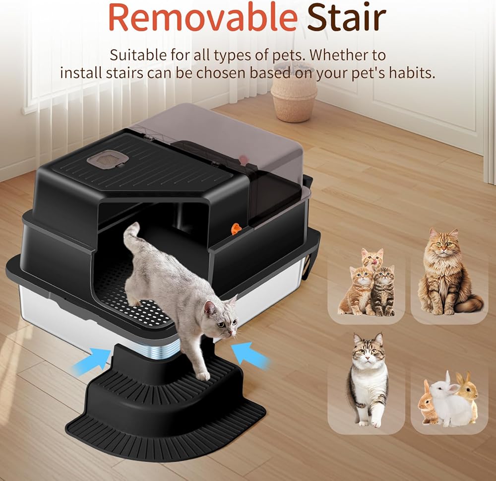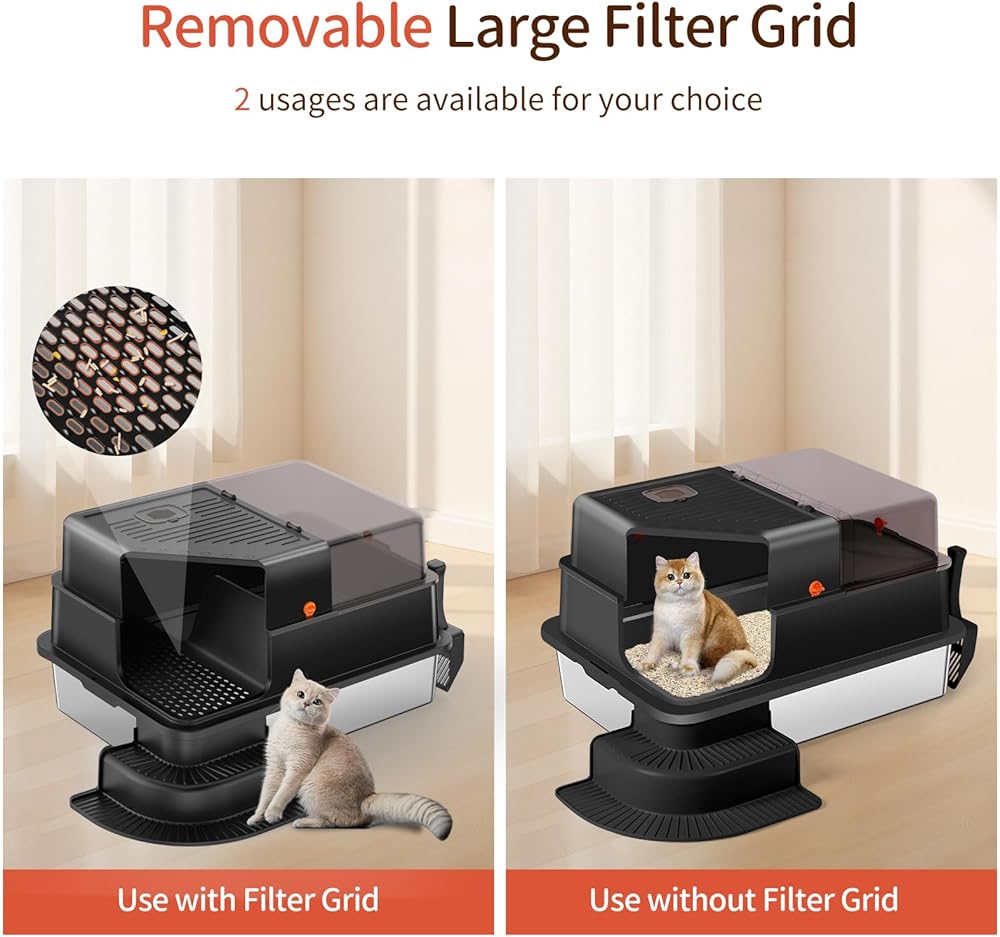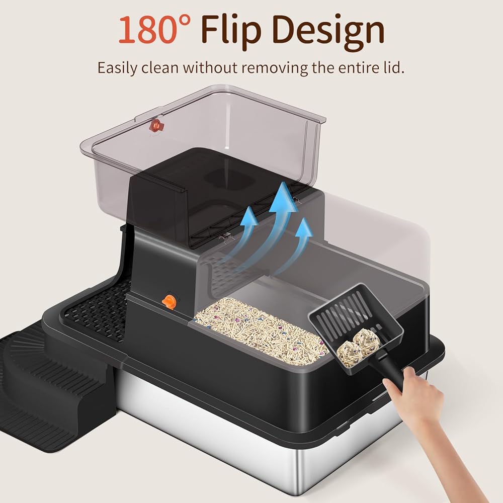 - This stainless steel litter box features a removable filter grid, detachable stairs, a 180° flip-top lid, and a litter scoop to meet all your needs.