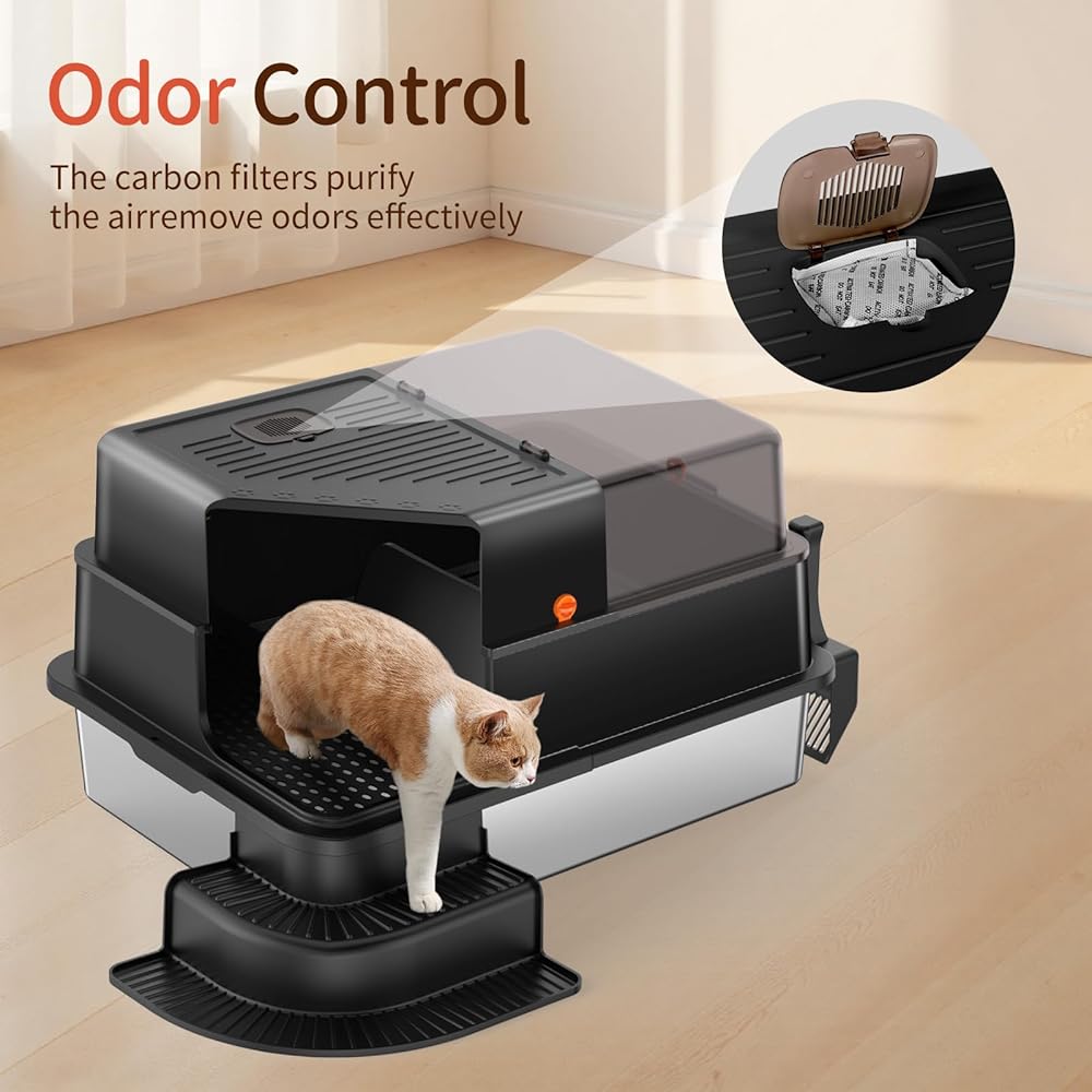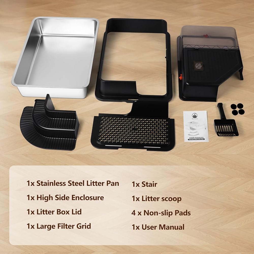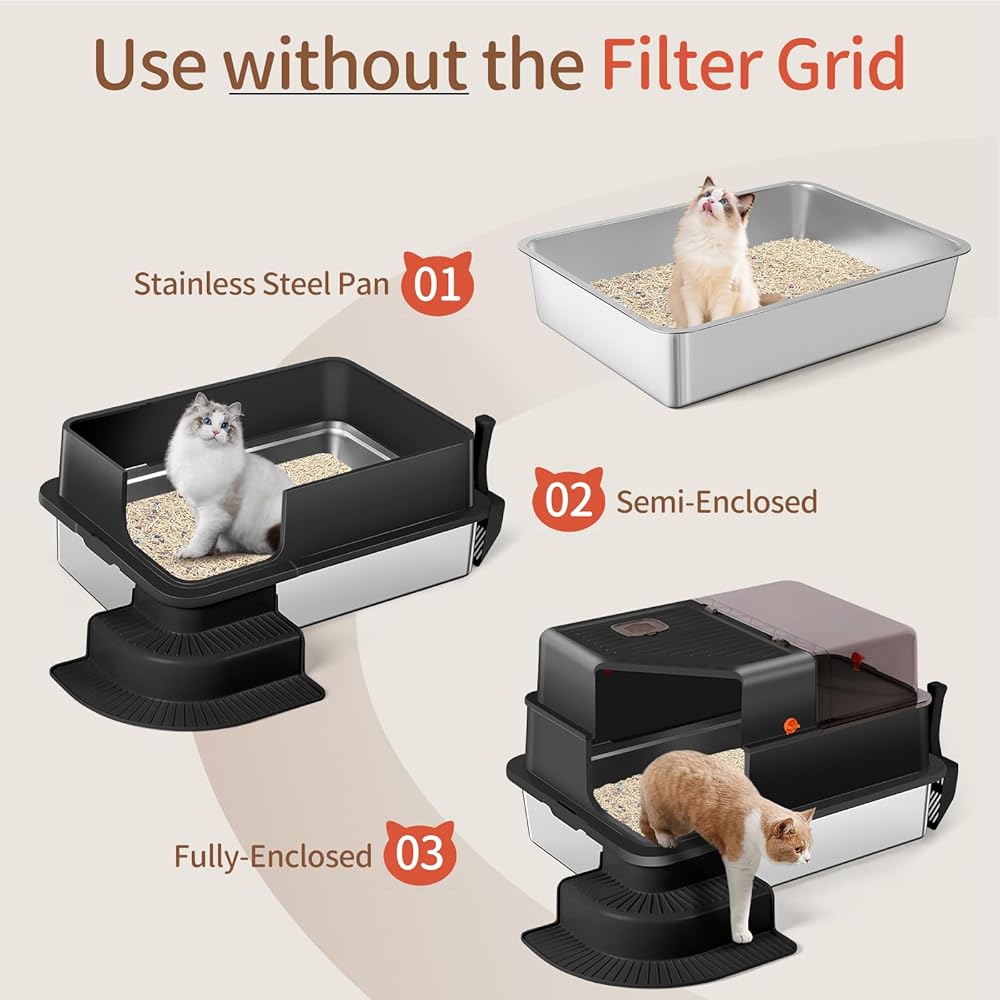 - This stainless steel litter box features a removable filter grid, detachable stairs, a 180° flip-top lid, and a litter scoop to meet all your needs.