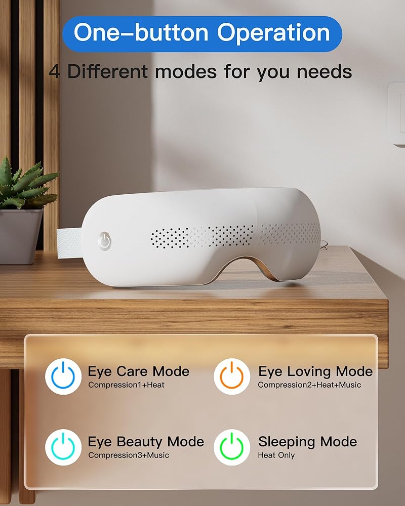 💕【4 PROTECTION MODES,SWITCH at WILL】:Eye massager allows you to enjoy true comfort and relaxation with just one press of the power button. Press the massage eye mask for 3 seconds to start (turn off). Short press the power button to cycle through the following massage modes: eye care mode, eye loving mode, eye beauty mode, and sleep mode. Meet different usage needs in a variety of scenarios. Overheat protection and 10minute auto-shutdown feature ensure safe use (Can be turned off manually).