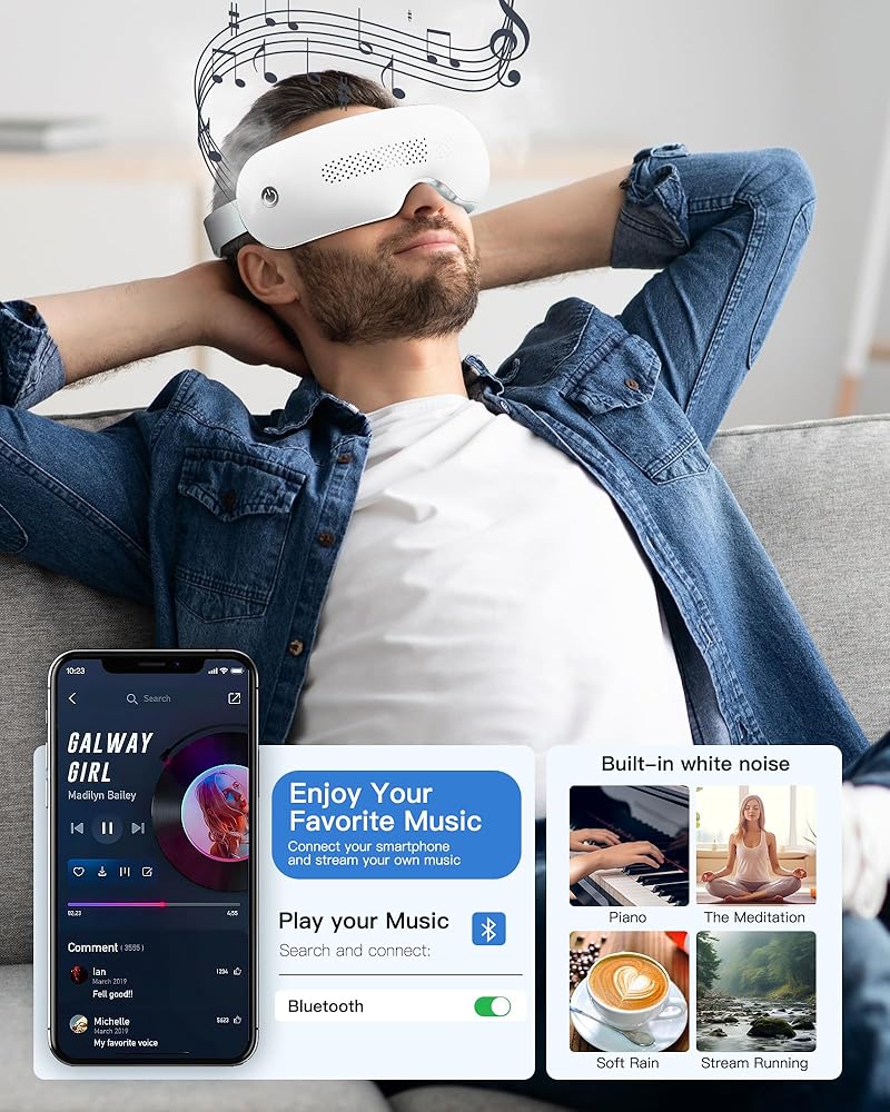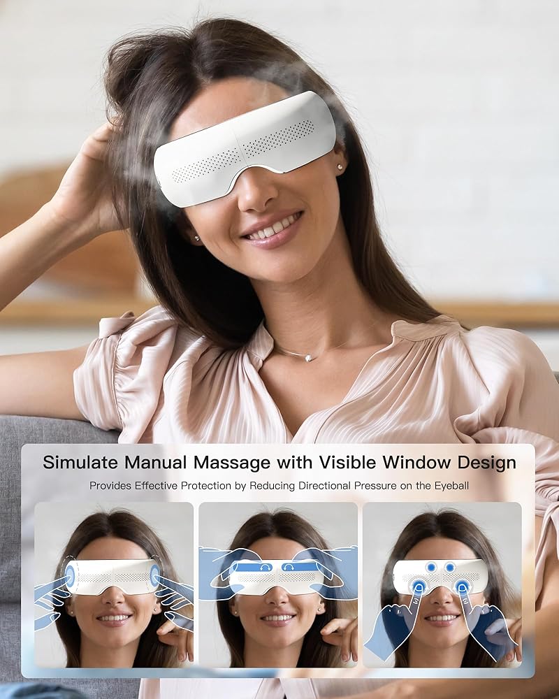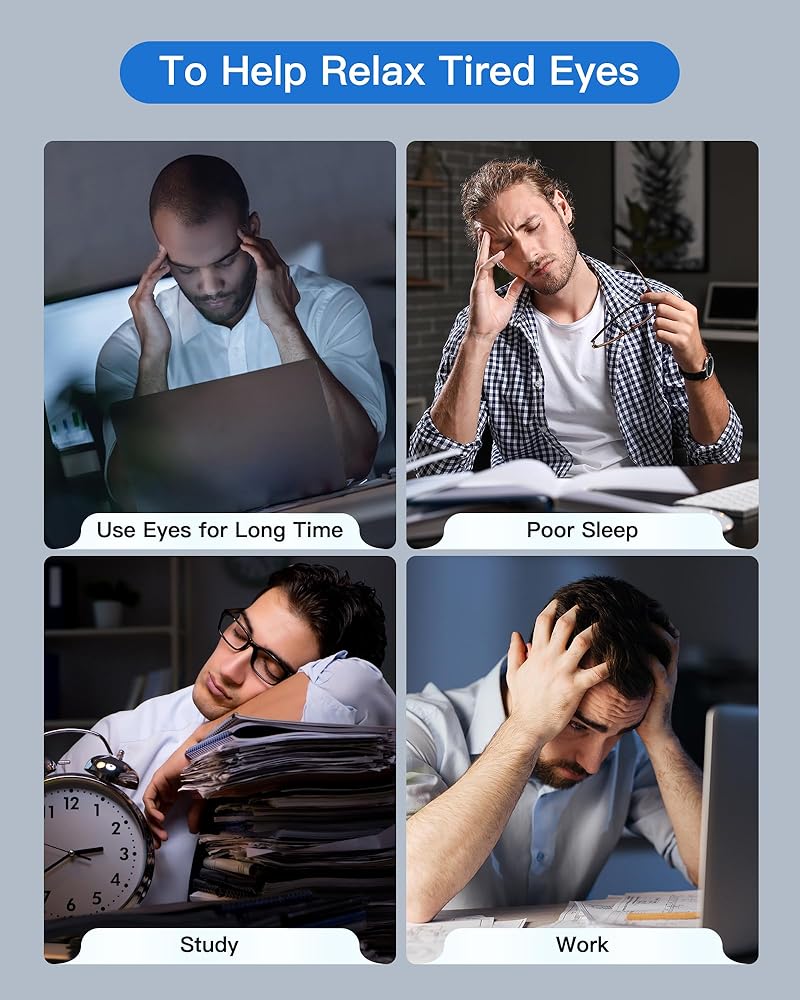 💕【Enjoy Your Favorite Music】:Double click to turn on/off music, you can play your favorite freely. Let you get rid of fatigue and enjoy your own massage moment. The visual window design can relieve eye fatigue without delaying daily work and entertainment. Grooved in the center of each side. Reduces directional pressure on the eyeball, providing effective protection.