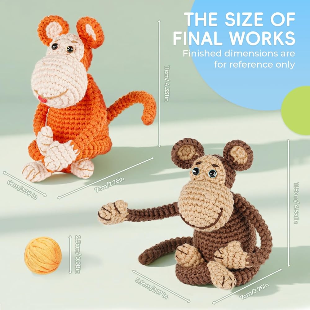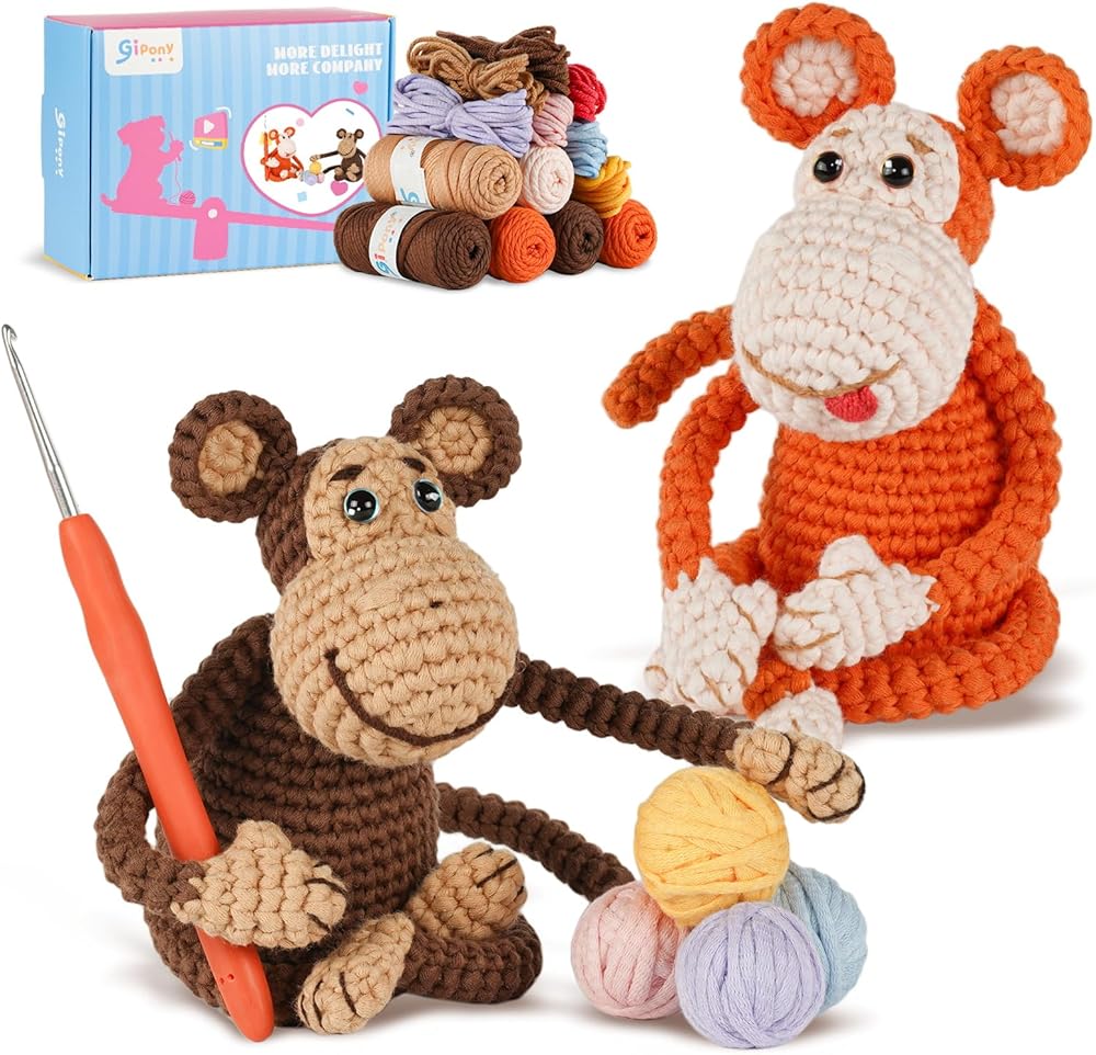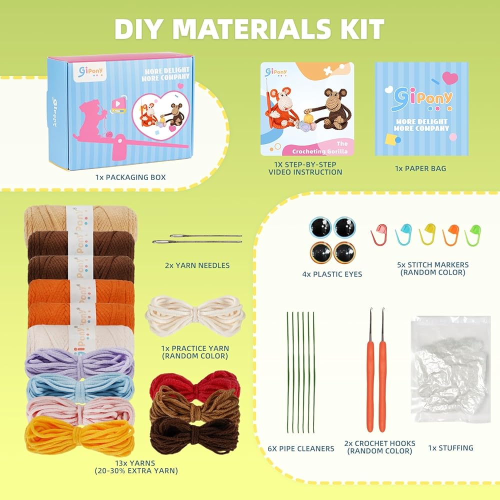 Gipony Crochet kit for Beginners Adults, Learn to Crochet, Include Easy Knitting Soft Yarn, Step-by-Step Video Tutorial, Hook, Holiday Birthday Gift (Two Gorillas)
