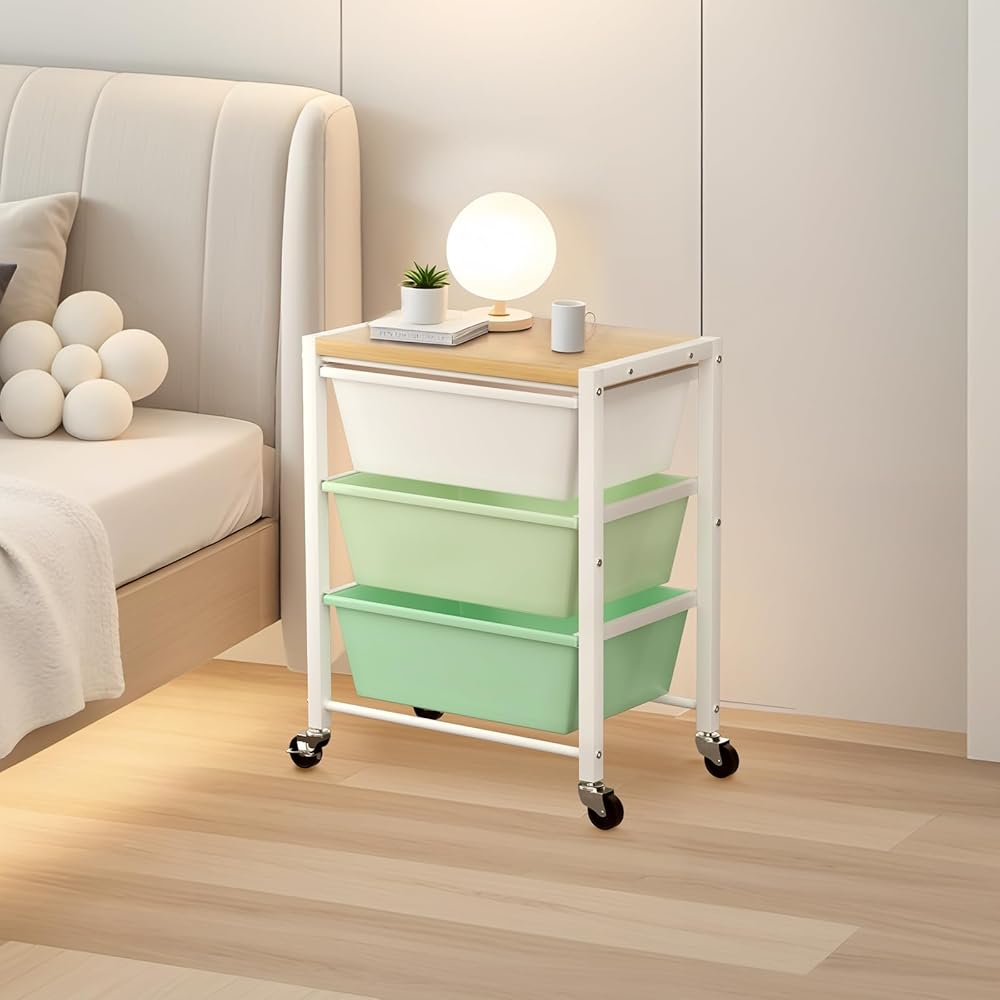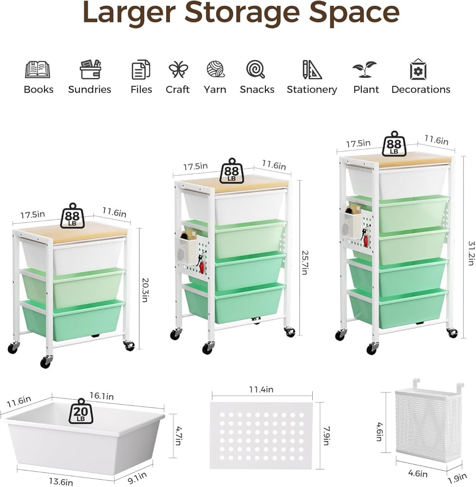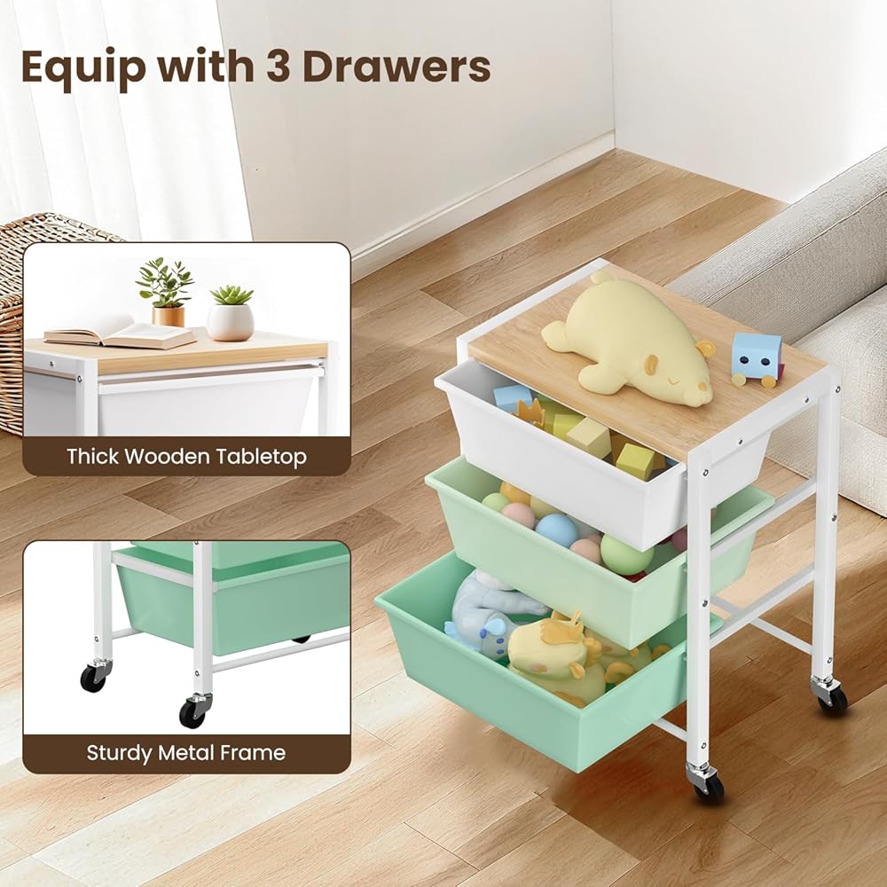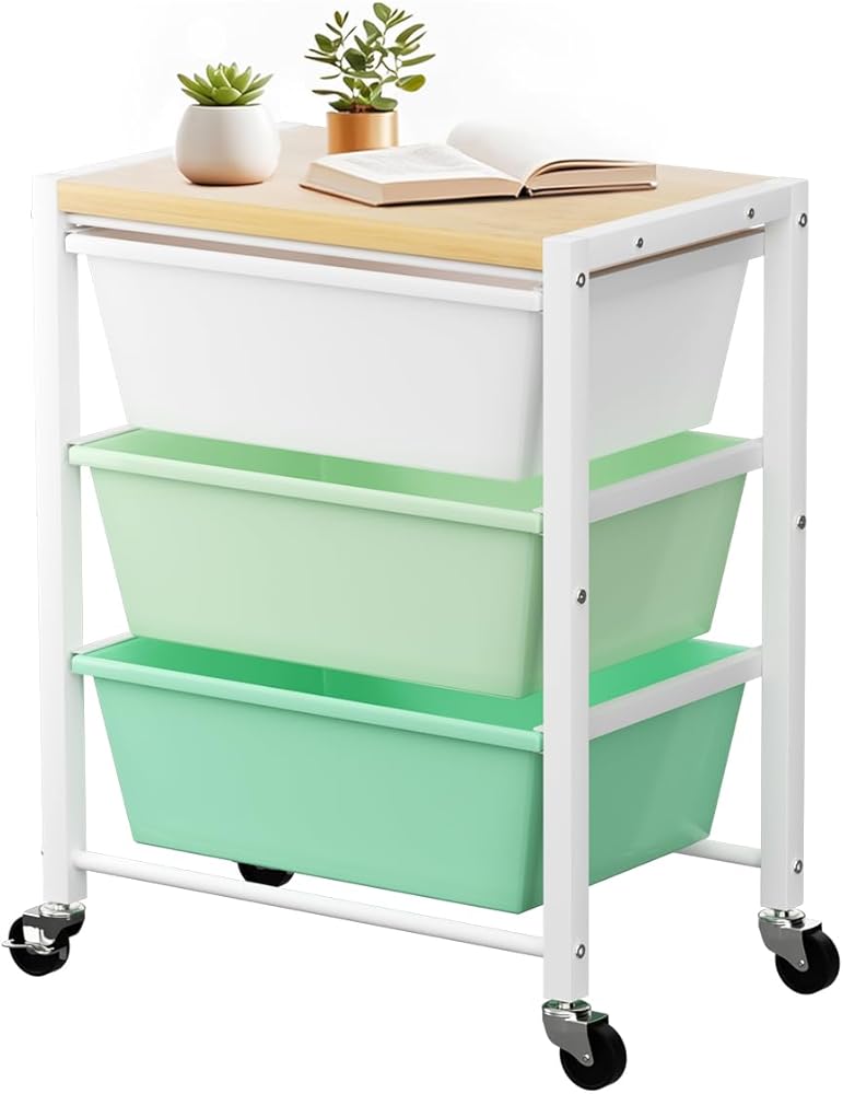 عربة دوارة مع 3 أدراج، عربات تخزين بأدراج بلاستيكية مع عجلات قابلة للقفل ومنضدة خشبية، منظم عربة الأدوات المعدنية، تنظيم وتخزين الحرف اليدوية في غرفة النوم والمكتب، أخضر ساطع