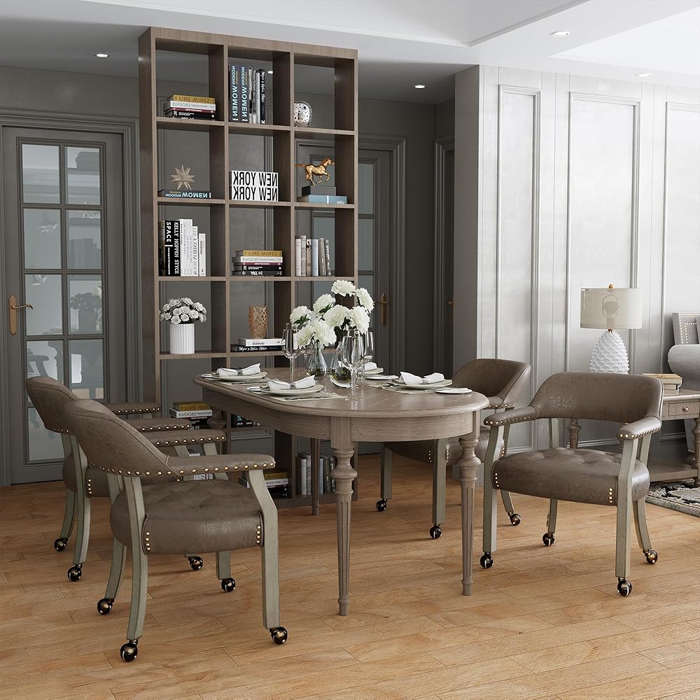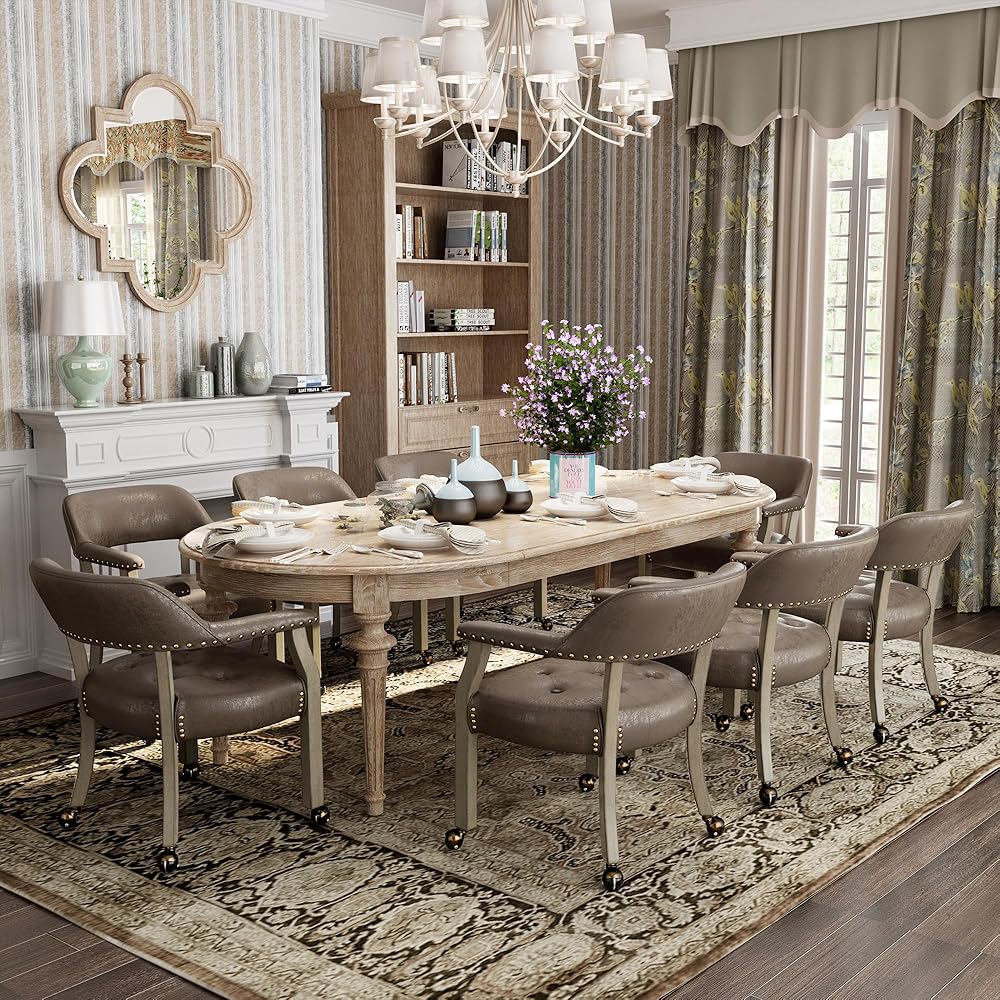 360 درجة كراسي متداول الدوران: أنيقة في التصميم ودائم في الجودة مع hobnail المحاطة ، عجلات القشرة المعدنية ، إطار الخشب المطاط الصلب ، أرجل الخشب الصلبة المنحنية ، مقعد منجد المفروم ، ودعم خلفي ممتاز. يتحرك كرسي تناول الطعام مع العجلات بسهولة معك على السجاد أو المشمع (التوصية). يتدحرج العجلات بما فيه الكفاية ولكن ليس الكثير لتنزلق عندما تستيقظ ، مما يضمن سلامتك بشكل أقصى. الأعلى. الحمل: 280 رطلاً.