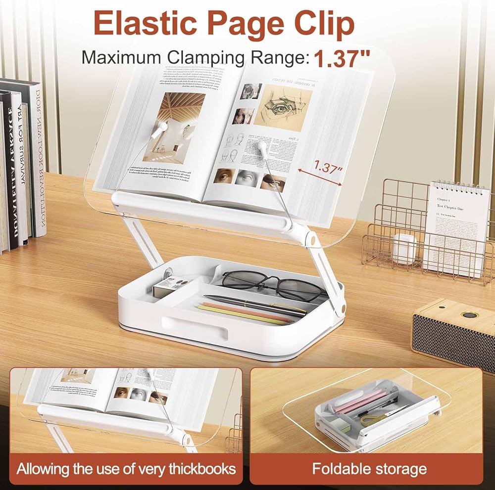 حامل كتاب أكريليك مع التخزين ، حامل كتاب قابل للتعديل للقراءة مع قواعد دوارة 360 درجة ، وقصة ناهض لسطح المكتب القابلة للطي ، ومقاطع مرنة لأجهزة الكتب الوصفية ، وأجهزة الكمبيوتر المحمولة (Clear)