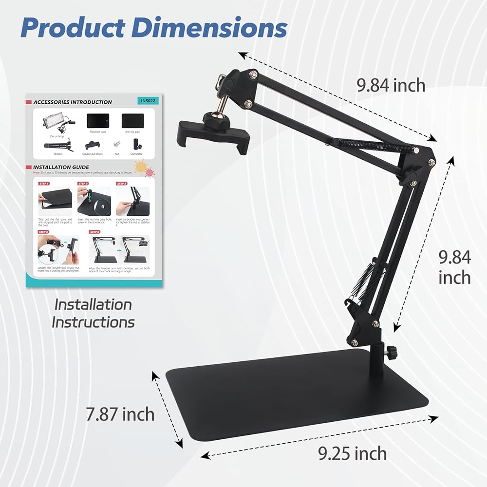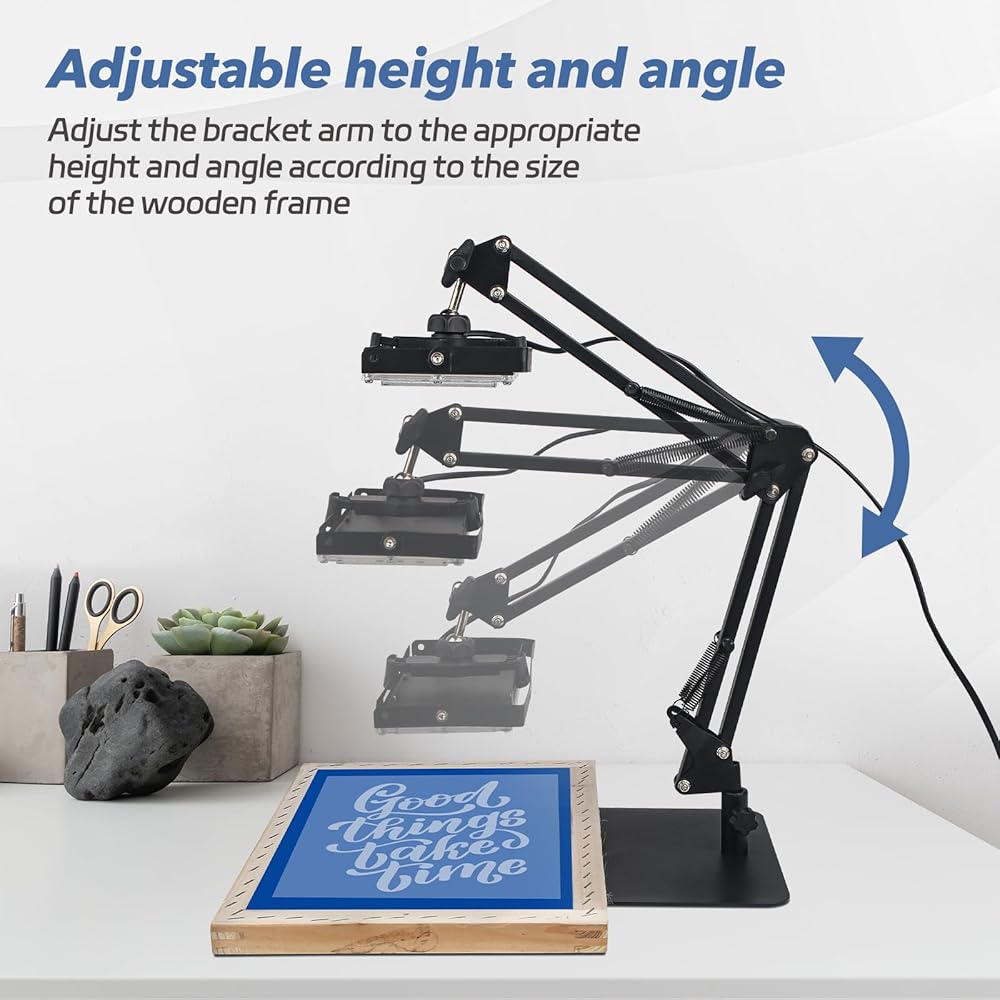 360 درجة قابلة للتعديل وقابلة للسحب: يتميز حامل ضوء الأشعة فوق البنفسجية بنطاق ارتفاع 1 "–20" وتناوب 360 درجة للتحكم الدقيق. يضمن تصميمه القابل للسحب توزيعًا موحدًا للضوء وحتى علاج - مثيل لطباعة شاشة الحرير