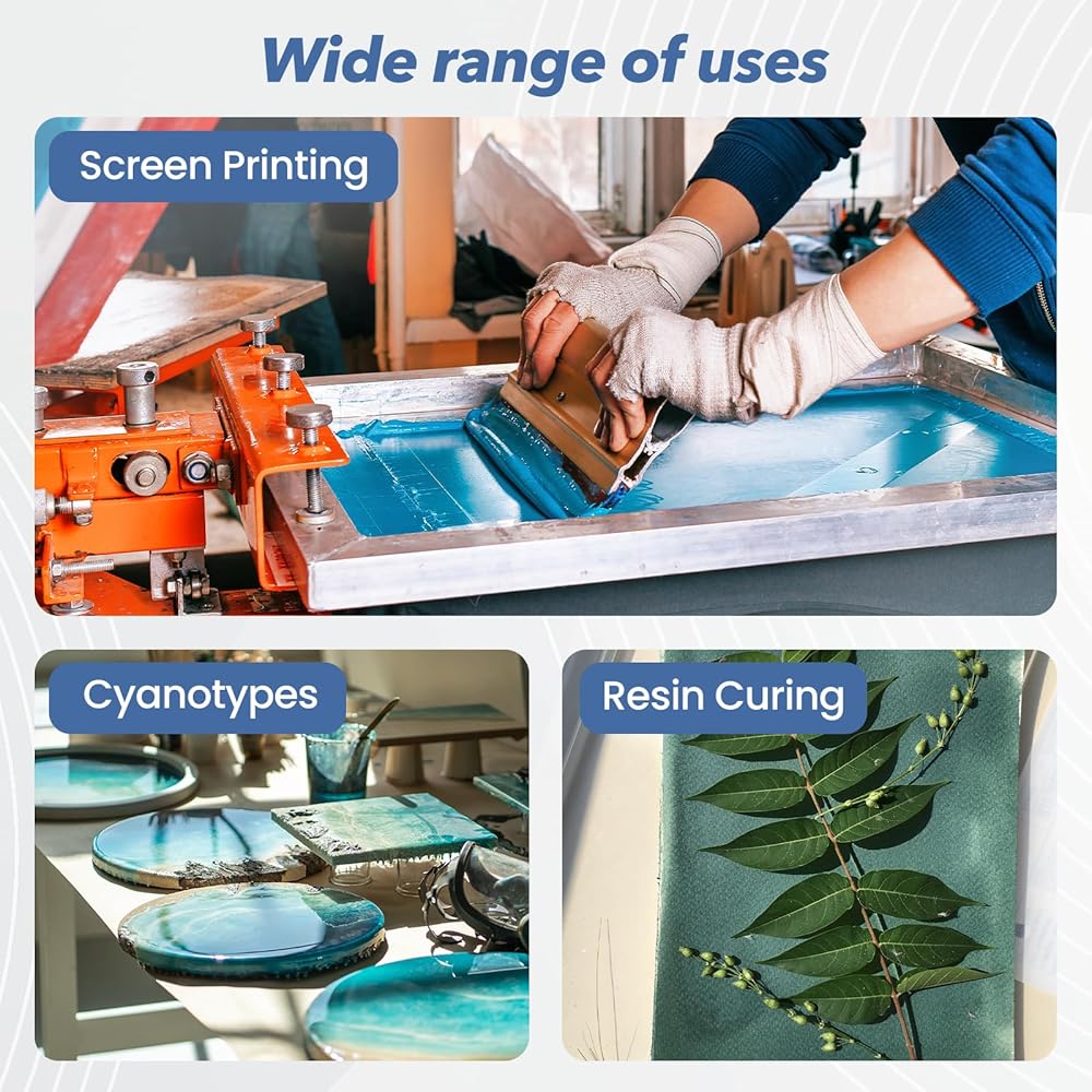 تطبيق متعدد الاستخدامات وآمن: يعمل ضوء الأشعة فوق البنفسجية لطباعة الشاشة مع مجموعات مستحلب الصور ، ومشاريع النمط الزرقاء ، وأكثر من ذلك. ملاحظة السلامة: الحد من الجلسات إلى 15 دقيقة مع تباطؤ 30 ثانية لحماية المكونات وضمان أداء طويل الأمد