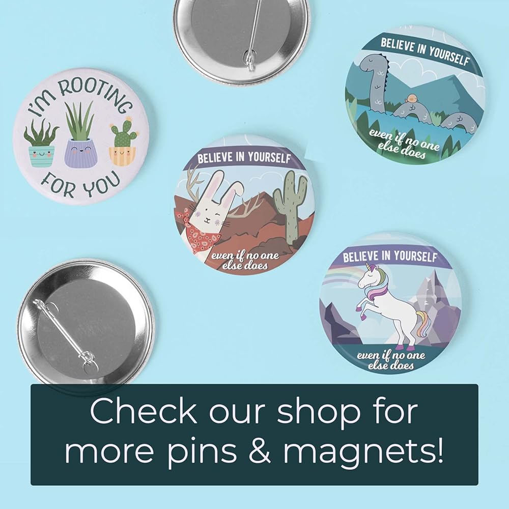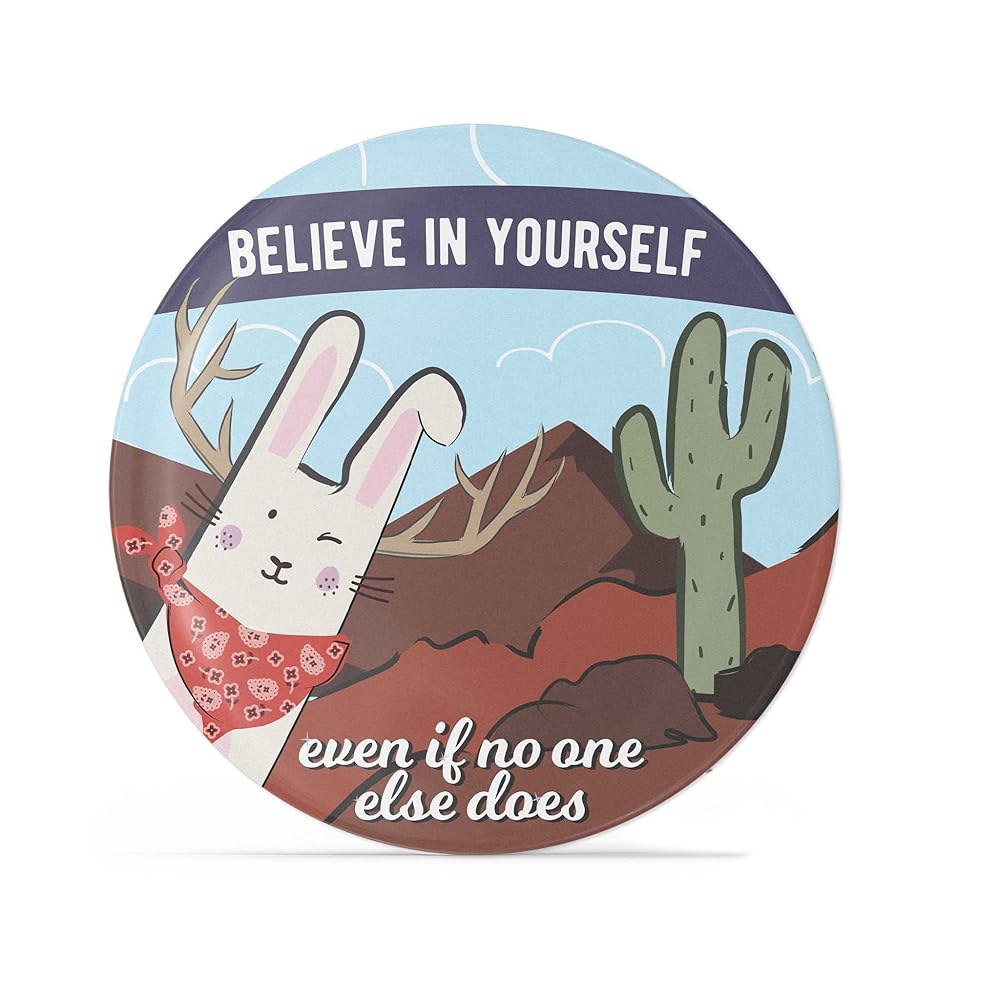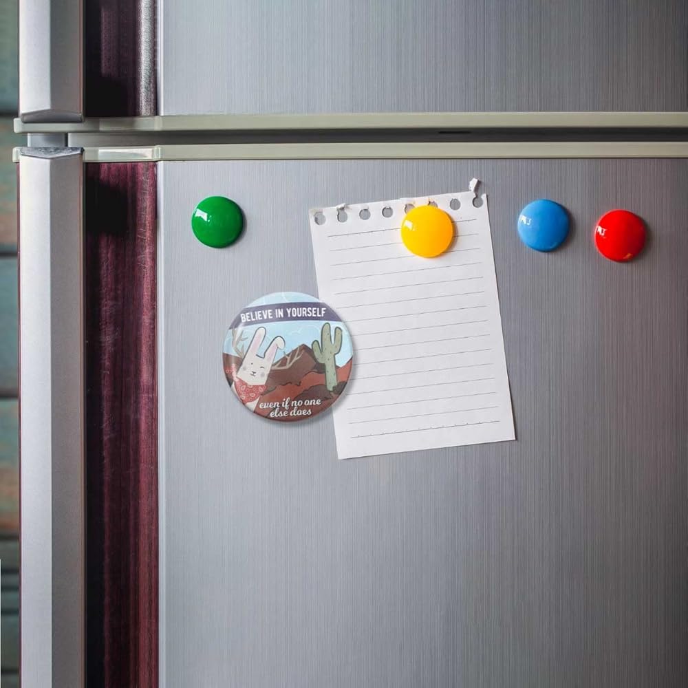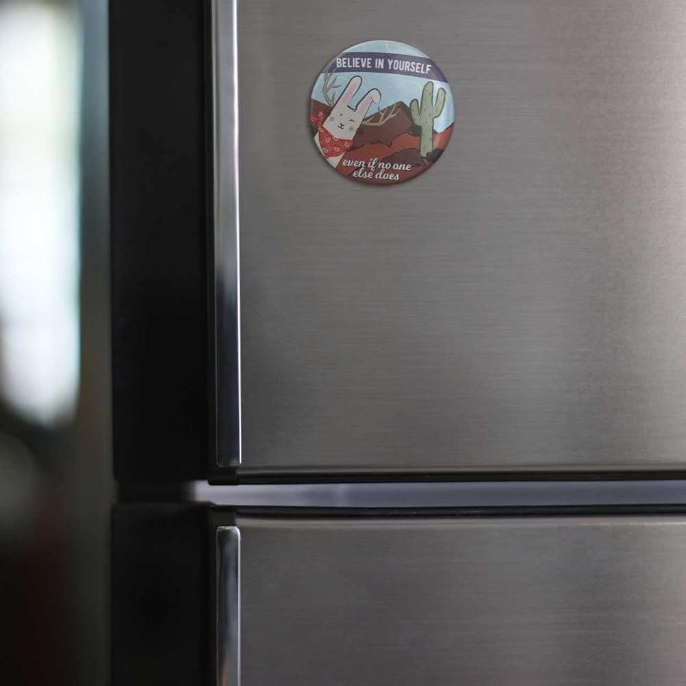 Believe in Yourself Jackalope Southwest fridge magnet, 2.25" wide. Durable 3D rounded metal button with strong magnet backing and a scratch-resistant smooth matte finish. Made in USA.