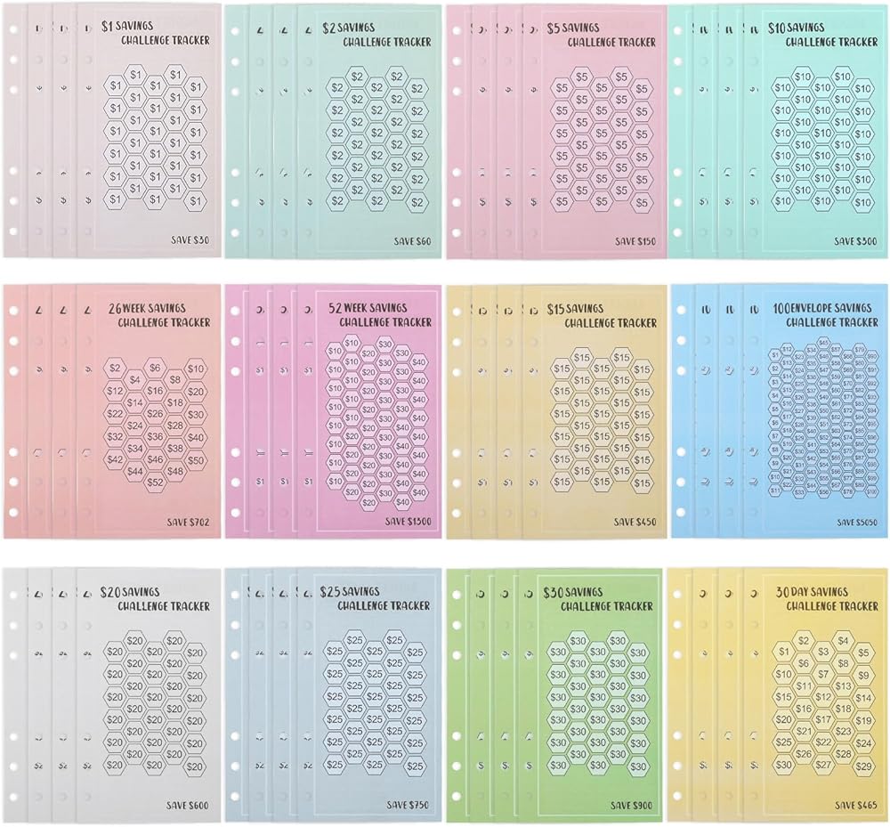 Comprehensive Savings Plans: This set includes 48 sheets of money saving challenge trackers with 12 different modes, such as $1, $5, $10, $20, $25, $30, 26-week, 30-day, 52-week, and 100-envelope challenges. Each mode has 4 cards, allowing you to choose the best plan for your income and goals. The A6 budget binder inserts are designed for short, medium, and long-term savings, making financial planning flexible and achievable