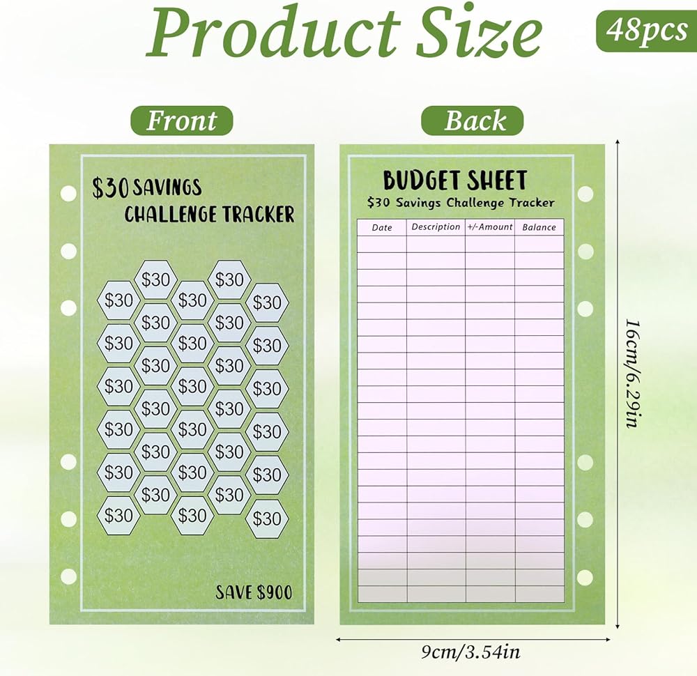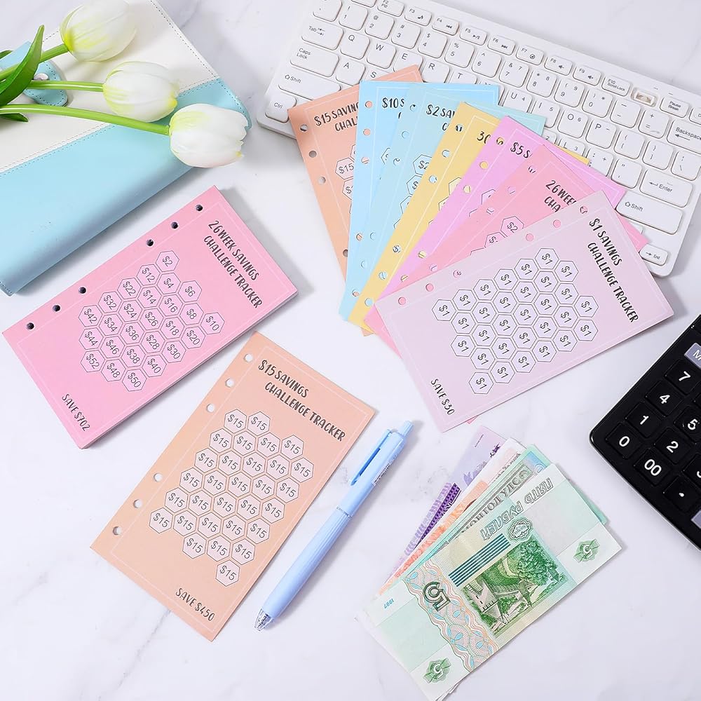User-Friendly Design: The money saving challenge cards are sized at 6.3x3.5 inches, perfectly fitting standard 6-ring A6 binders. The laminated surface allows for reuse with dry-erase or permanent markers, and the colorful designs help distinguish between different plans. The hexagonal pattern adds a fun visual element, making tracking savings enjoyable and motivating