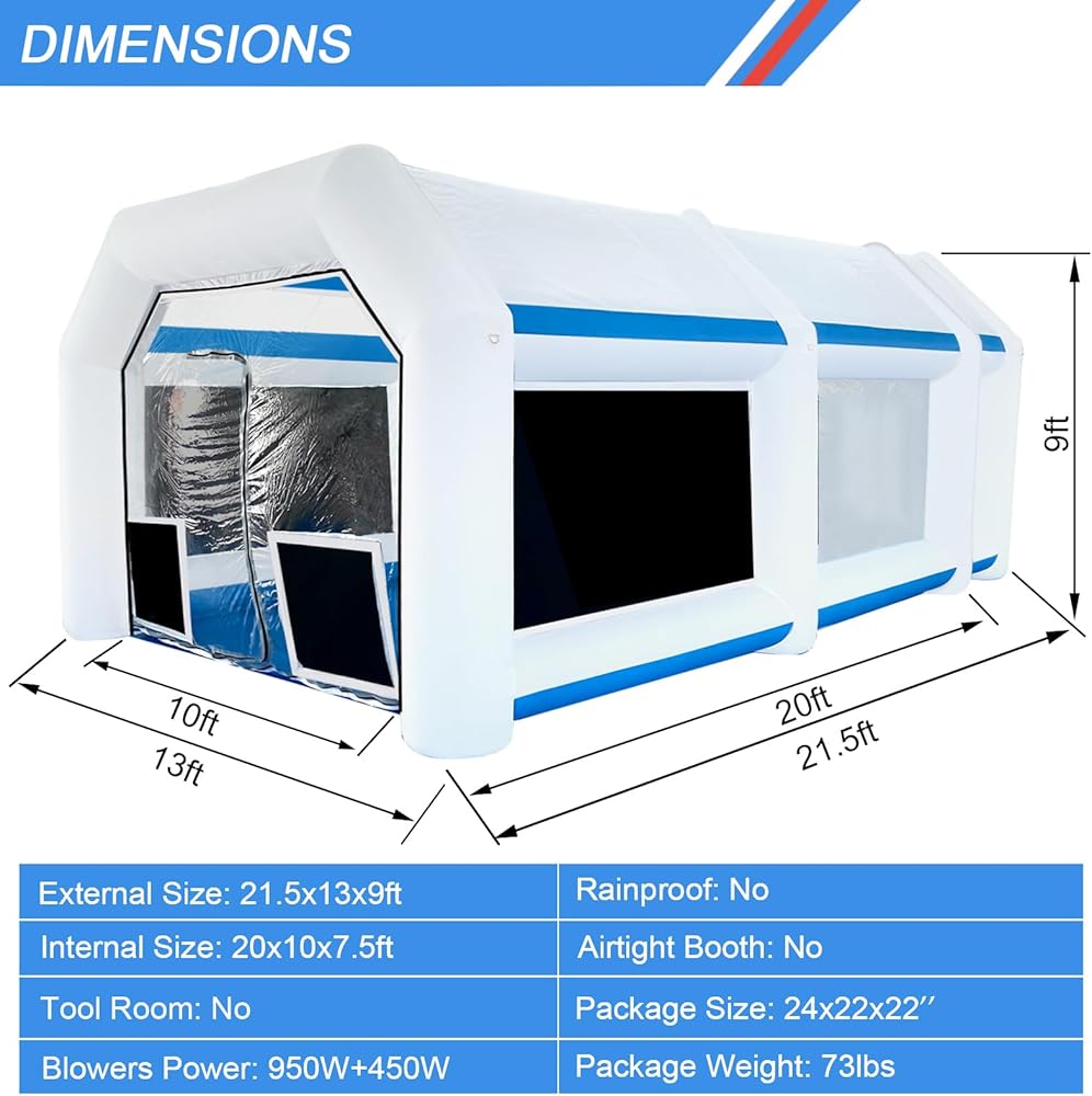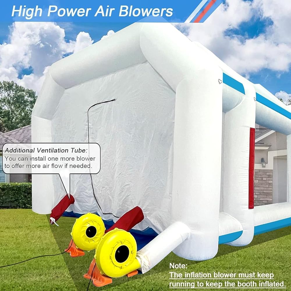 اثنان من المنفرين القويين+ أنبوب منفاخ تهوية إضافي واحد: تم تجهيز كشك الرش القابل للنفخ بمنفاخ التضخم 1100W ومنفاخ التهوية 950W. يمكن أن تلبي الاستخدام العادي. إذا كنت بحاجة إلى مزيد من تدفق الهواء في مكان العمل لتقليل الفائض بشكل أفضل عند رش العناصر الكبيرة ، فهناك أنبوب منفاخ تهوية إضافي ، يمكنك شراء منفاخ آخر لتحسين تداول الهواء. (الطاقة الموصى بها من منفاخ إضافي: ≤950W/1.25HP)