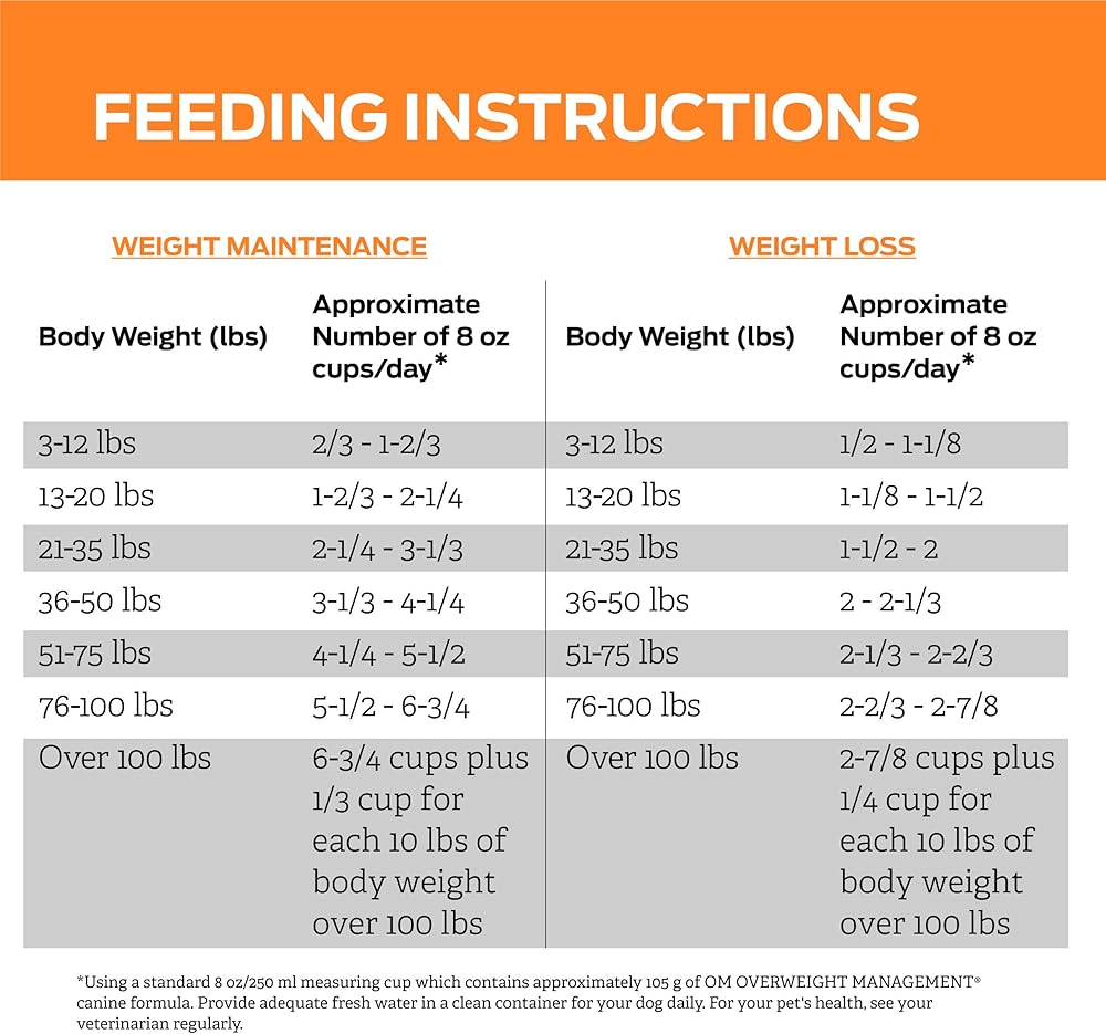 Helping manage your dog's weight is essential to keeping him healthy, and a healthy-weight dog food like Purina Pro Plan Veterinary Diets OM Overweight Management Canine Formula dog kibble can make a big difference. This high-protein dog food is low in fat and calories and has a high protein-to-calorie ratio; it's specifically formulated to help dogs lose weight while maintaining muscle. To further help manage his weight, each serving of this weight management dog food contains natural fiber to help contribute to satiety, while isoflavones help reduce the risk of weight regain and fat accumulation. This formula also supports urinary health in dogs by promoting a urinary environment unfavorable to the development of both sterile struvite* and calcium oxalate crystals. Talk to your veterinarian and see if Purina Pro Plan Veterinary Diets OM Overweight Management Canine Formula dog kibble is right for your dog. *Most struvite uroliths in dogs are caused by urinary tract infections. In the case of nonsterile struvite uroliths, it is important to treat with the appropriate antibiotic in addition to dietary management.