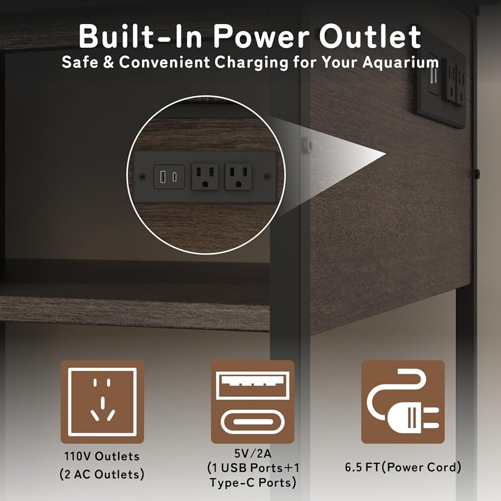مزود بمنفذ طاقة وضوء LED: يحتوي حامل خزان الأسماك الذي يبلغ طوله 55 جالون على منافذ طاقة مدمجة ومنفذ USB واحد ومنفذ نوع واحد من النوع C لتشغيل أجهزتك وشحنها. هذا يبقي الحبال منظمة وتبسيط إدارة حوض السمك. يأتي أيضًا مع مصابيح LED RGB التي يمكنك التحكم في أنماط اللون والميض مع التحكم عن بُعد ، مما يضيف نداءًا بصريًا لإنشاء جو فريد.