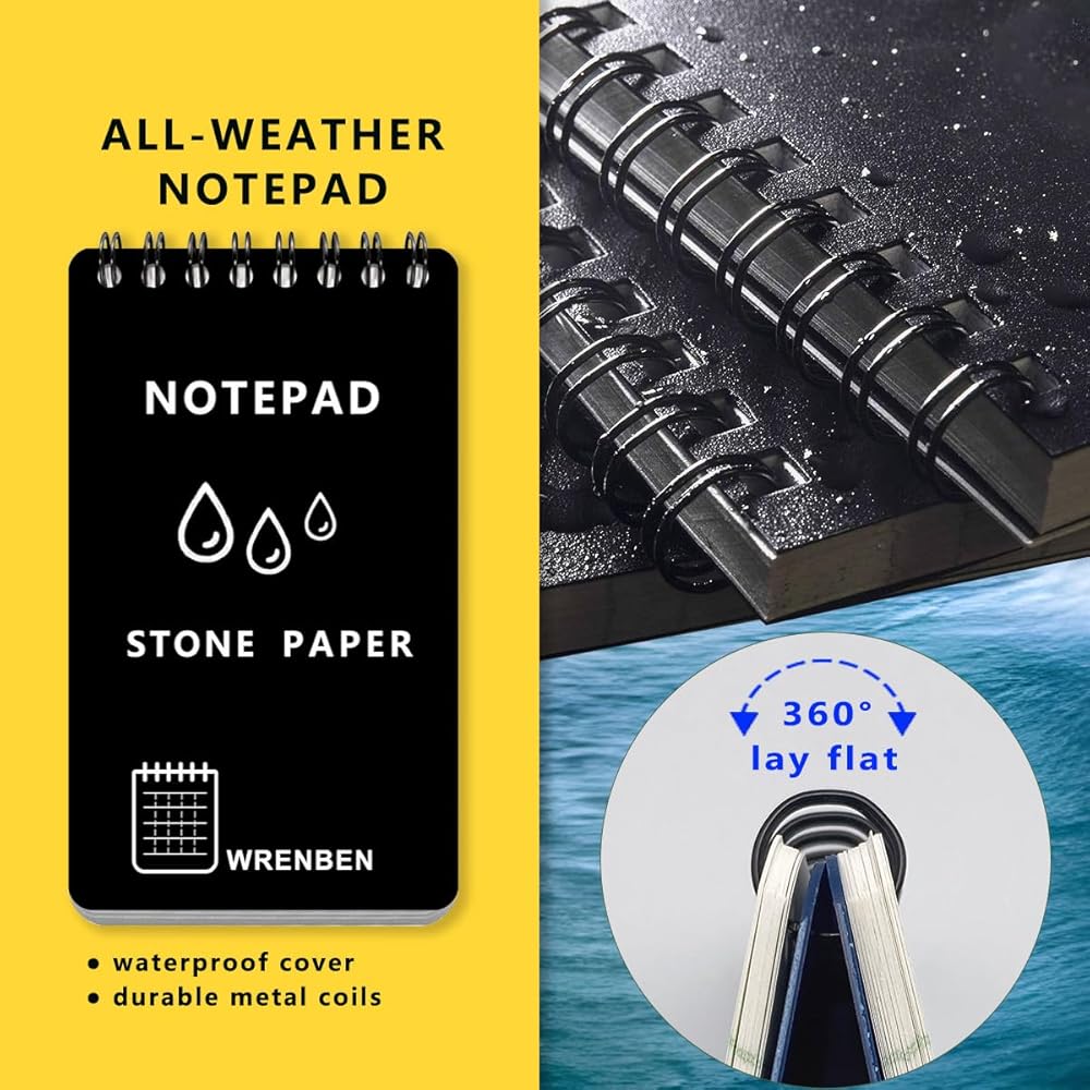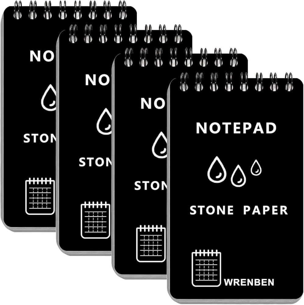 4 قطع دفتر ملاحظات حلزوني مقاوم للماء مقاس 3 × 5 بوصات مع ورق رسم بياني حجري، مفكرة جيب مناسبة لجميع الأحوال الجوية A7، وسادات مذكرة ستينو للعمل في الهواء الطلق، والسفر، والحقل، والعسكري (أسود، 4 عبوات)