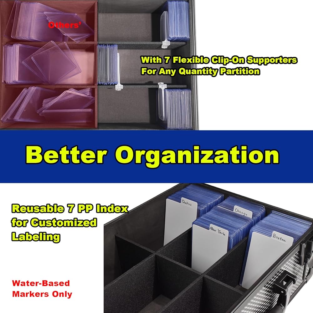 • ✅【 المنظمة الذكية وإمكانية الوصول دون عناء】 تحويل الفوضى إلى الطلب مع تخزين البطاقة الرياضية المهنية هذه! كل مربع يحتوي على 4 مقصورات مقسمة ثابتة ، بالإضافة إلى 7 مقسمات مرنة وبطاقة فهرسة 7 لتصنيف وإصلاح وتسمية المجموعات ، وتمكينك من إنشاء تخطيطات مخصصة لبطاقات من جميع الأنواع والكميات المختلفة ، والاختيار من 3 أحجام و 5 خزائن ألوان لتوسيع مجموعاتك وتطويرها.