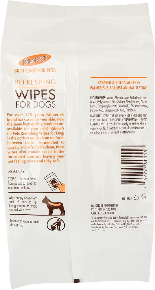 For over 175 years, Palmer's brand has cared for your skin. Now the same high quality products are available for your pets! Palmer's for Pets Puppy Wipes are a quick and gentle way to freshen up your new addition to the family. Formulated with ultra moisturizing cocoa butter to nourish the skin and coat. This 100 count of puppy wipes are gentle and soothing. The pet wipes have Vitamin E to gently wipe away dirt and debris. Perfect for your new puppy supplies kit, Palmer's Cocoa Butter Puppy Wipes are perfect for between baths or on-the-go travel pet supplies. Warnings: Keep out of reach of children and pets to avoid possible consumption. Avoid contact with eyes. Do not apply to broken skin or open wounds. If irritation occurs, discontinue use. If condition persists, consult a veterinarian. YOUR SATISFACTION IS OUR PRIORITY: If you have any questions or feedback about this product, please reach out to us directly at info fetch4pets and our customer service team will be happy to speak with you.