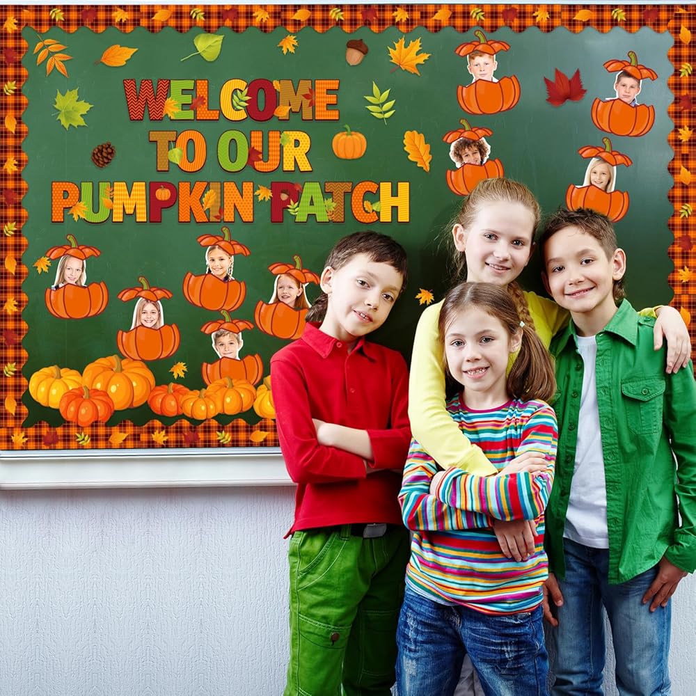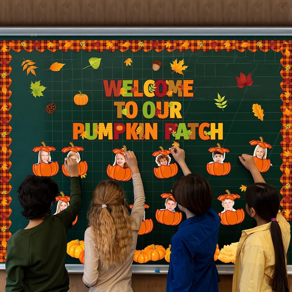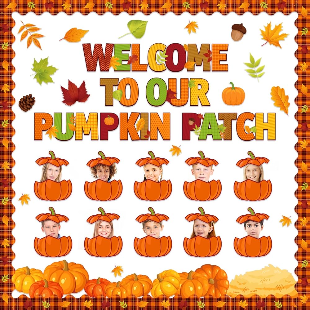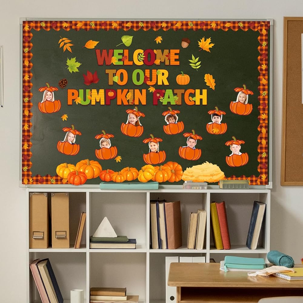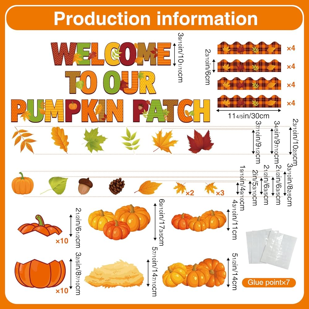 • Autumn Bulletin Board Decoration: The set includes "WELCOME TO OUR PUMPKIN PATCH" letter stickers, 16 assorted autumn leaves,10 pumpkin head frames, 4 pumpkin decorations, hay bale accents, and 4.8 meters of border trim – perfect for any seasonal display.