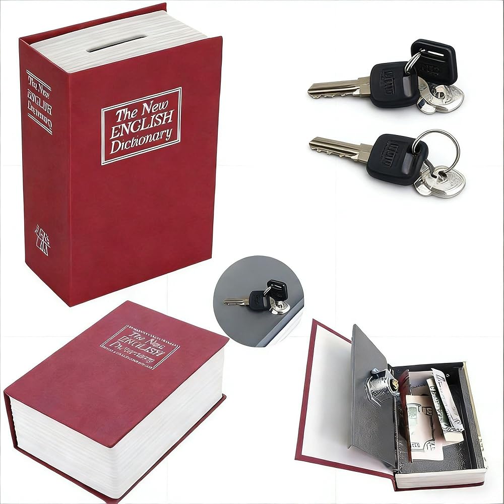 غلاف كتاب الأزياء: محمول وآمن: يتيح لك الحجم المعتدل لصندوق المال حمله بسهولة في جيب الجينز ؛ الصندوق واسع بما يكفي لتخزين مبلغ جيد من النقود ولكن تأكد من مغادرة المفاتيح في المنزل أثناء استخدامه لتأمين أرباحك بأمان ، فإن هذا الكتاب الآمن مع القفل الرئيسي سيمزج بسهولة مع الكتب أو الكائنات الأخرى على أي رف أو طاولة.