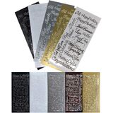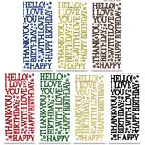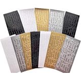 تحتوي مجموعة الملصقات الفريدة هذه على 500 ملصقات لصنع البطاقات. كل ورقة هي 4 "x9" مع 12 ورقة. تحتوي هذه المجموعة على ثلاث تحيات نصية مميزة لكل منها بالذهب والفضة والأبيض والأسود لتعزيز جميع مشاريع قصاصات DIY والحرف اليدوية.
