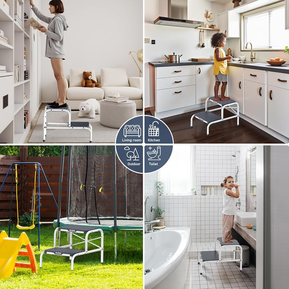 • MULTIPLE USE: The step stool for adults is the perfect blend of practicality and safety. The optimal height allows for easy access to shelves, cabinets, and other hard-to-reach places, which can be used by adults or children on different occasions, such as in the kitchen, bedroom, bathroom or office.