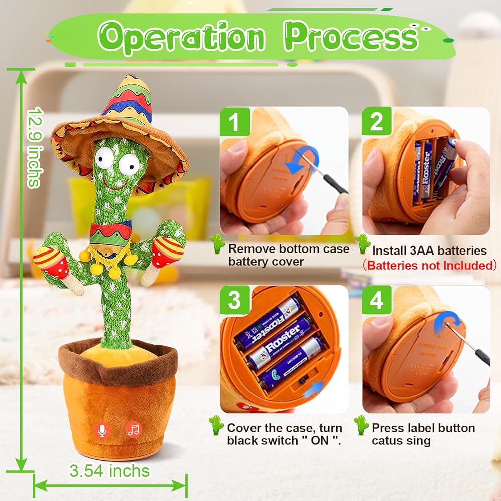 [Taking Cactus Kids Toys]Dancing singing cactus toy is crafted from non-toxic, safe, and soft plush fabric. This toy meets international safety standards for children's toys, including CPSIA, CPC, and ASTM certificates.