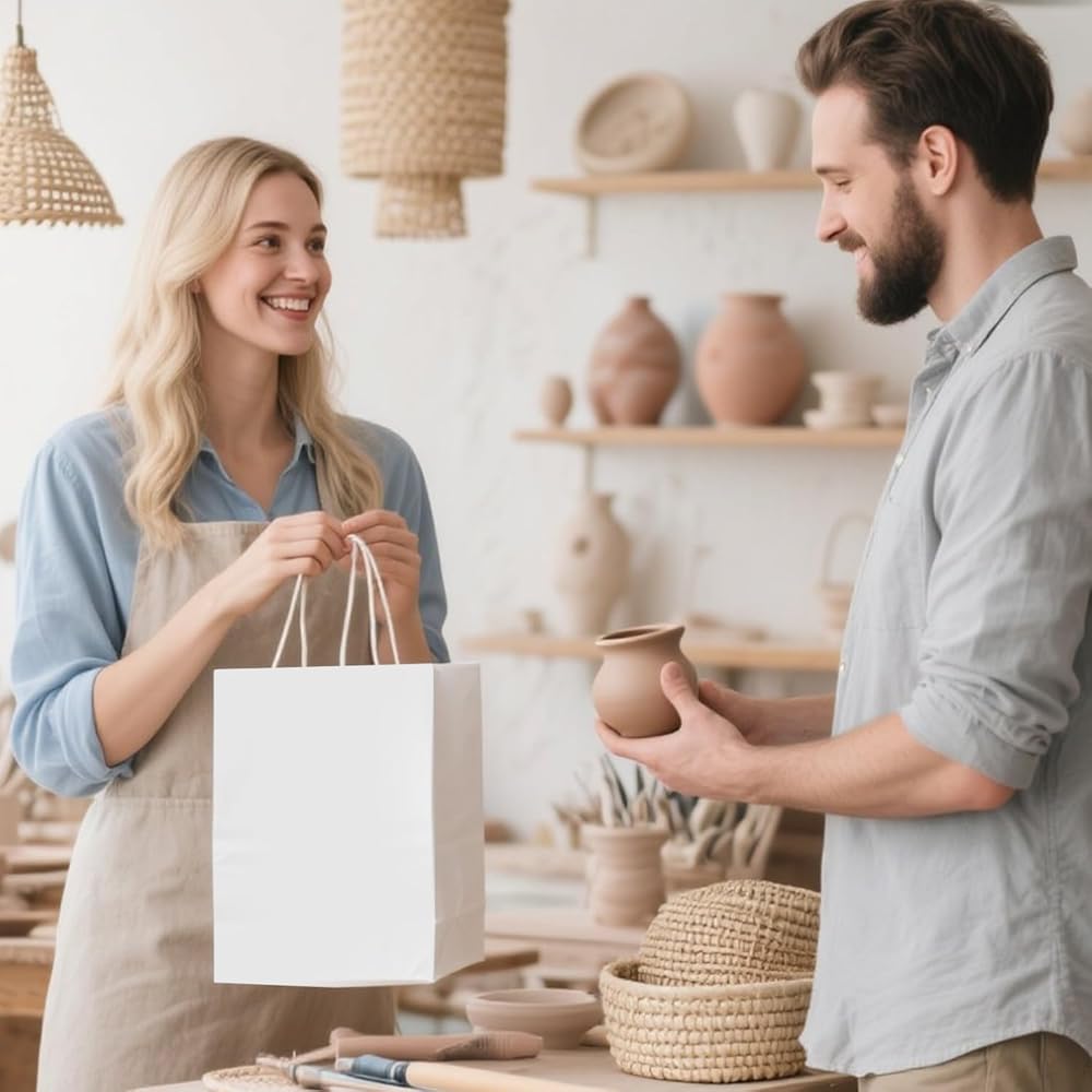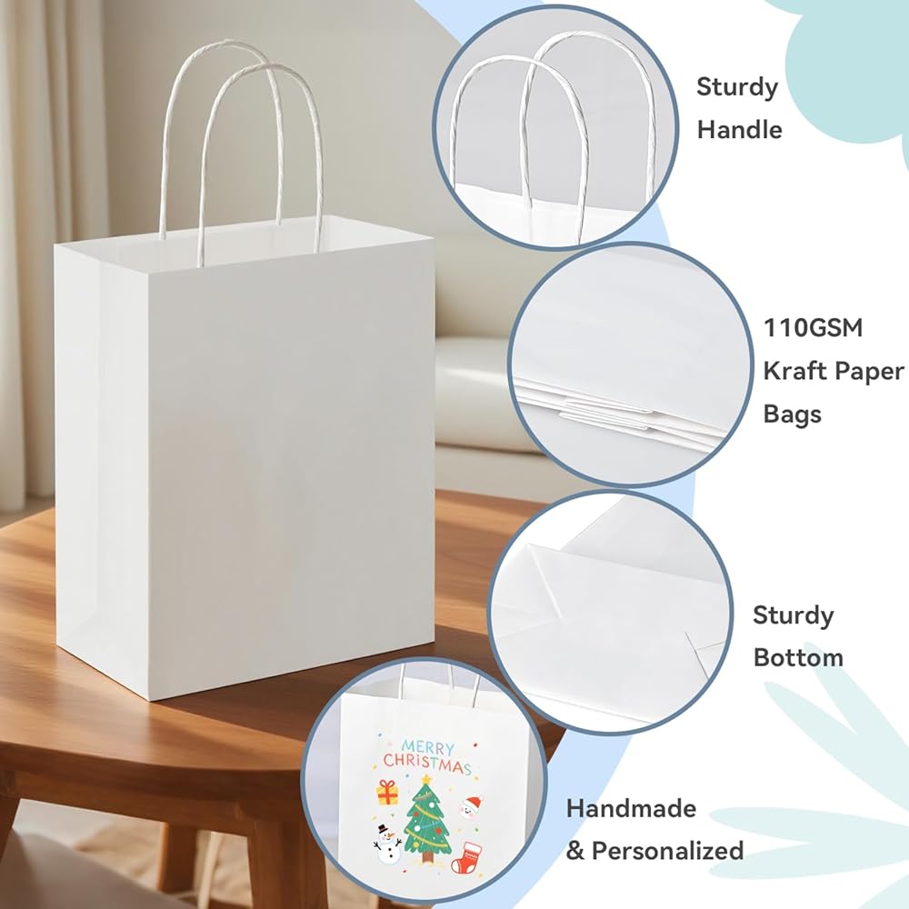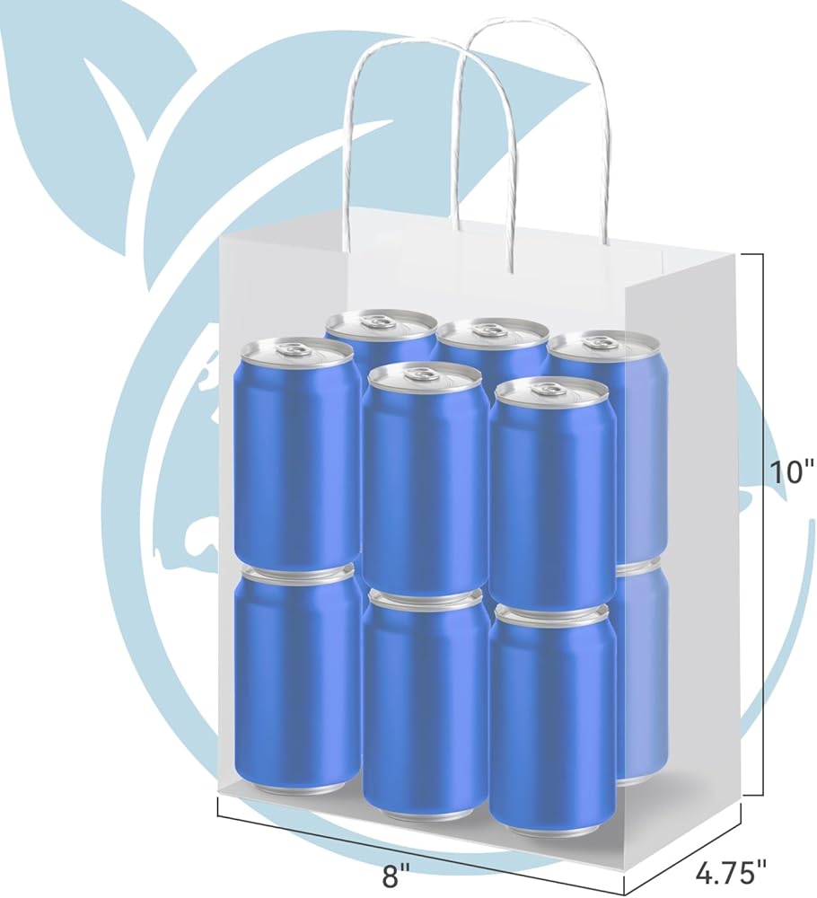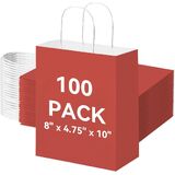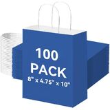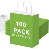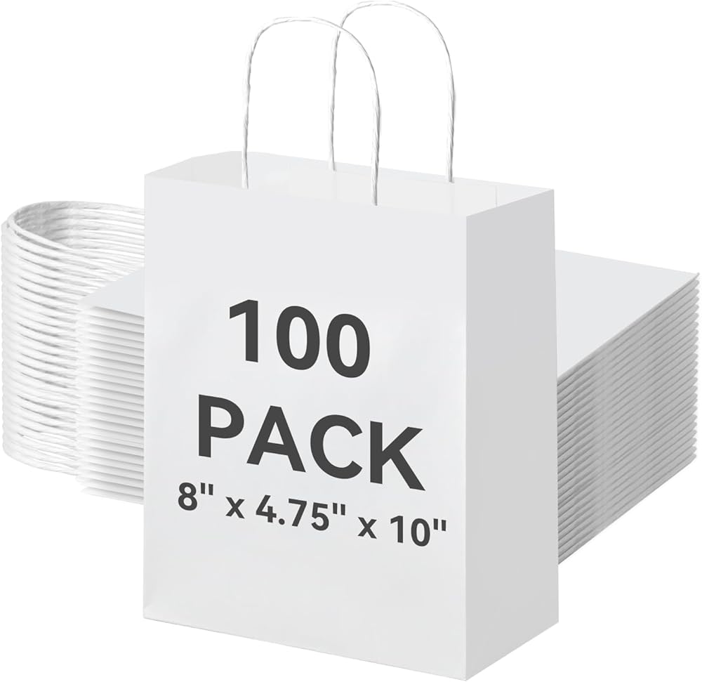 Brothersbox 100pcs حقائب الهدايا الورقية البيضاء متوسطة الحجم 8x4.75x10 بوصة ، أكياس ورقية Kraft مع مقابض كبيرة للتسوق ، الحرف ، الأعمال ، البيع بالتجزئة ، الحفلات ، تناول الطعام ، Goodie ، البقالة